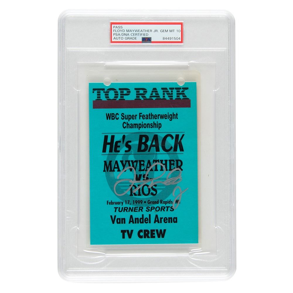 Laminated 4.25 x 6.5 TV crew pass for the WBC Super Featherweight championship fight between Floyd Mayweather, Jr. and Carlos Rios on February 17, 1999, signed in silver ink by Mayweather. Mayweather defeated Rios by unanimous decision in twelve rounds. In very fine condition. Encapsulated and graded by PSA/DNA as "GEM MT 10."