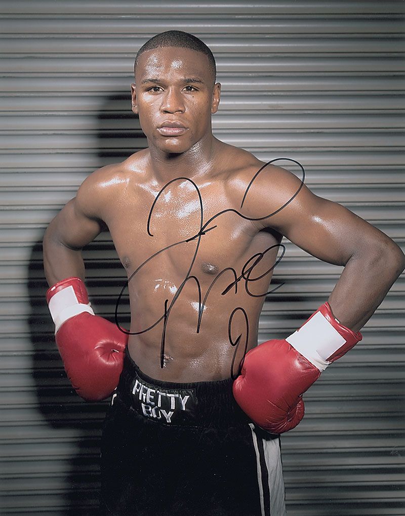 Color satin-finish 11 x 14 photo of Mayweather in his trunks and gloves, signed in black felt tip. In very fine condition.
