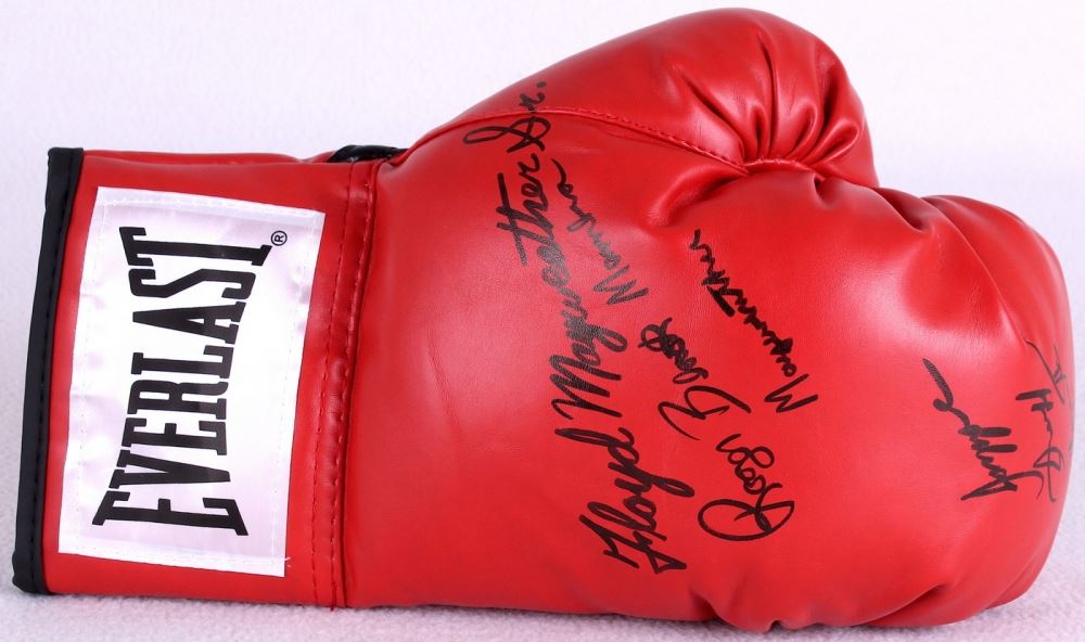 Red Everlast boxing glove. Hand-signed in black felt-tip pen by Floyd Mayweather Sr., Roger "Black Mamba" Mayweather, and Jeff "Jazzy" Mayweather. The autographs include an official James Spence Authentication (JSA) hologram and matching COA for authenticity purposes.