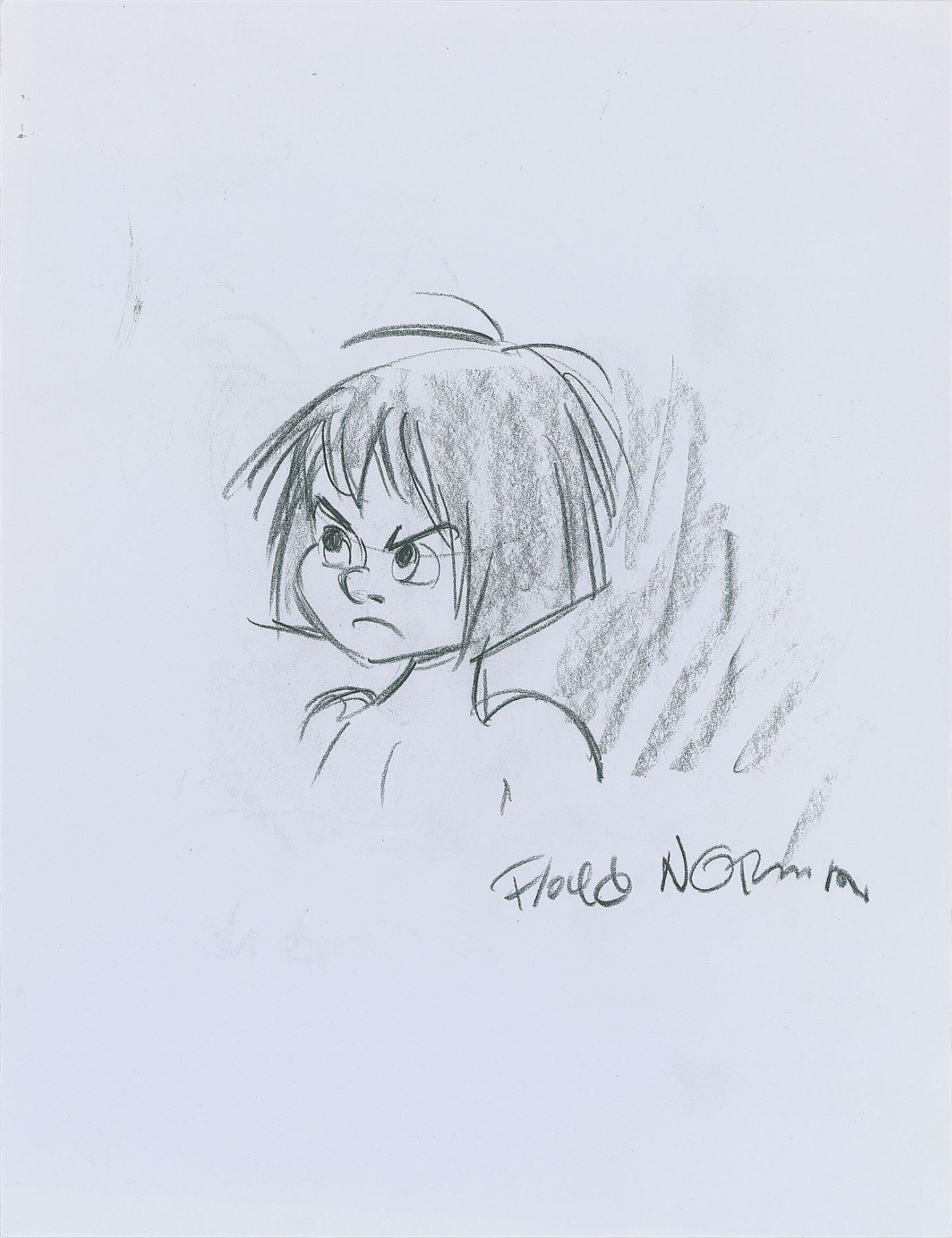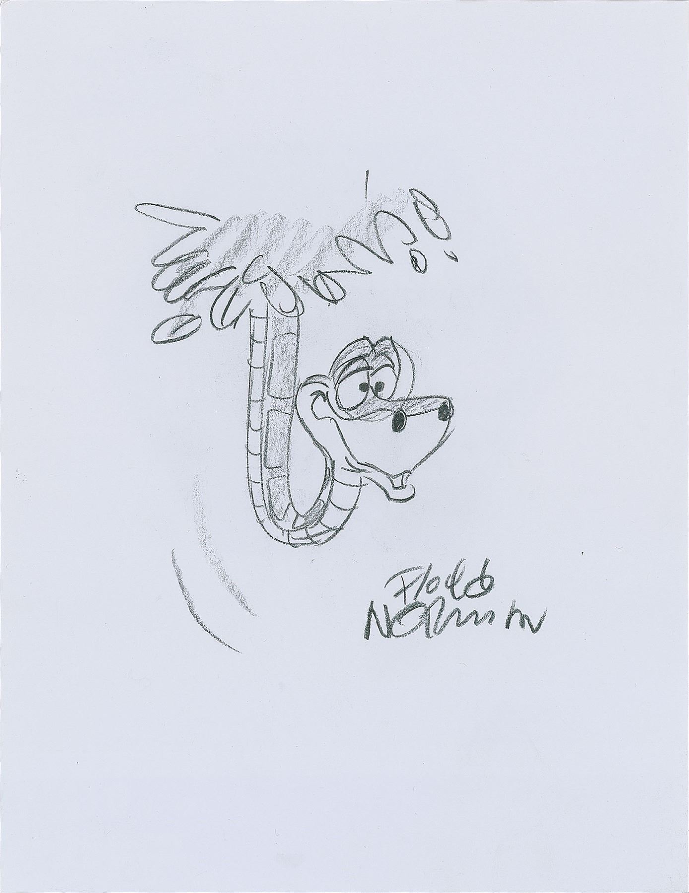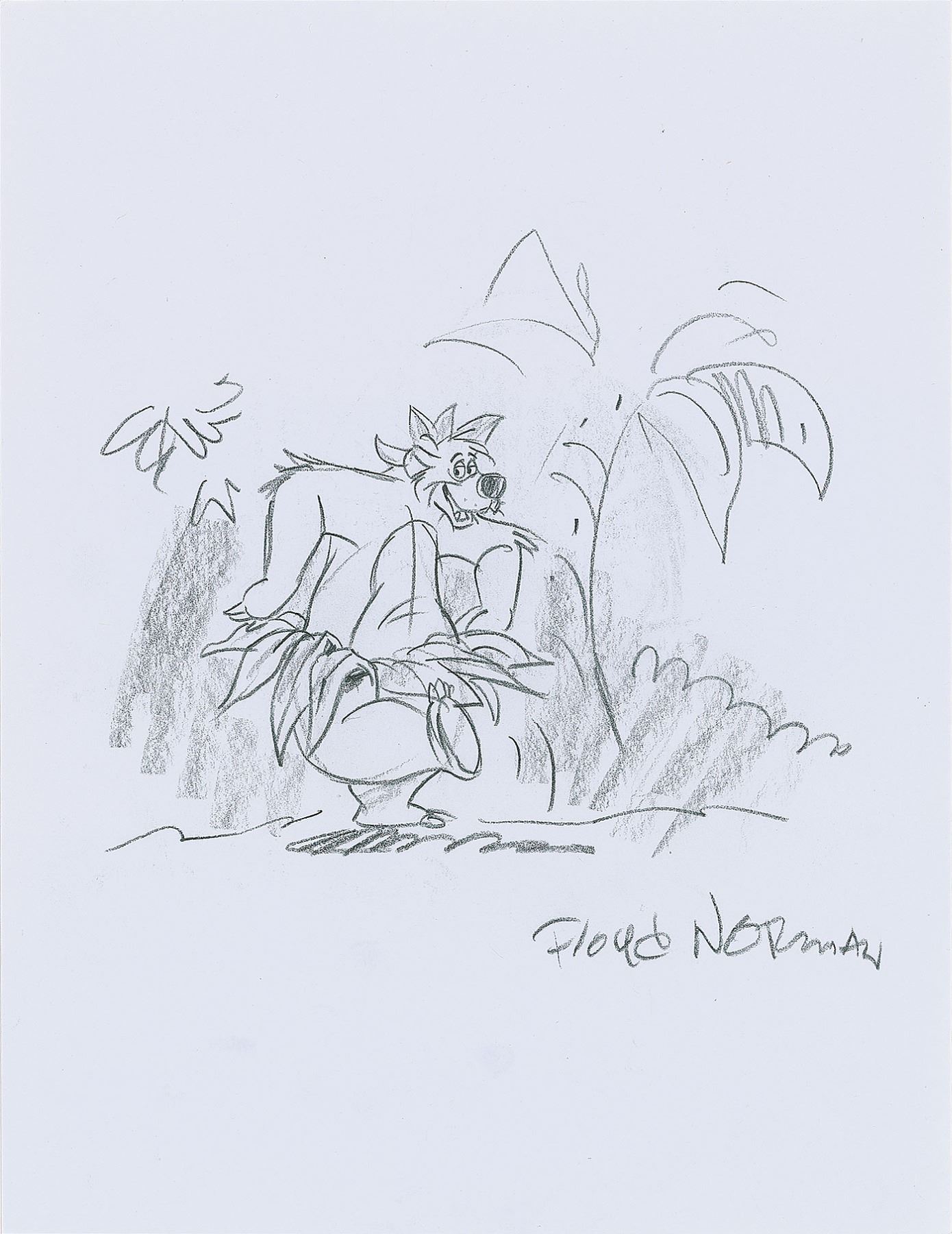 American animator, writer, and comic book artist (born 1935) who has worked for animation companies like Walt Disney Animation Studios, Hanna-Barbera Productions, Ruby-Spears, Film Roman, and Pixar. Appealing set of three Jungle Book character pencil sketches by legendary animator Floyd Norman on three white 8.5 x 11 heavy paperstock sheets, each of which is signed below by Norman. The sketches include: an upset Mowgli; Kaa emerging from a branch; and Baloo dancing in the jungle. In overall very fine condition.