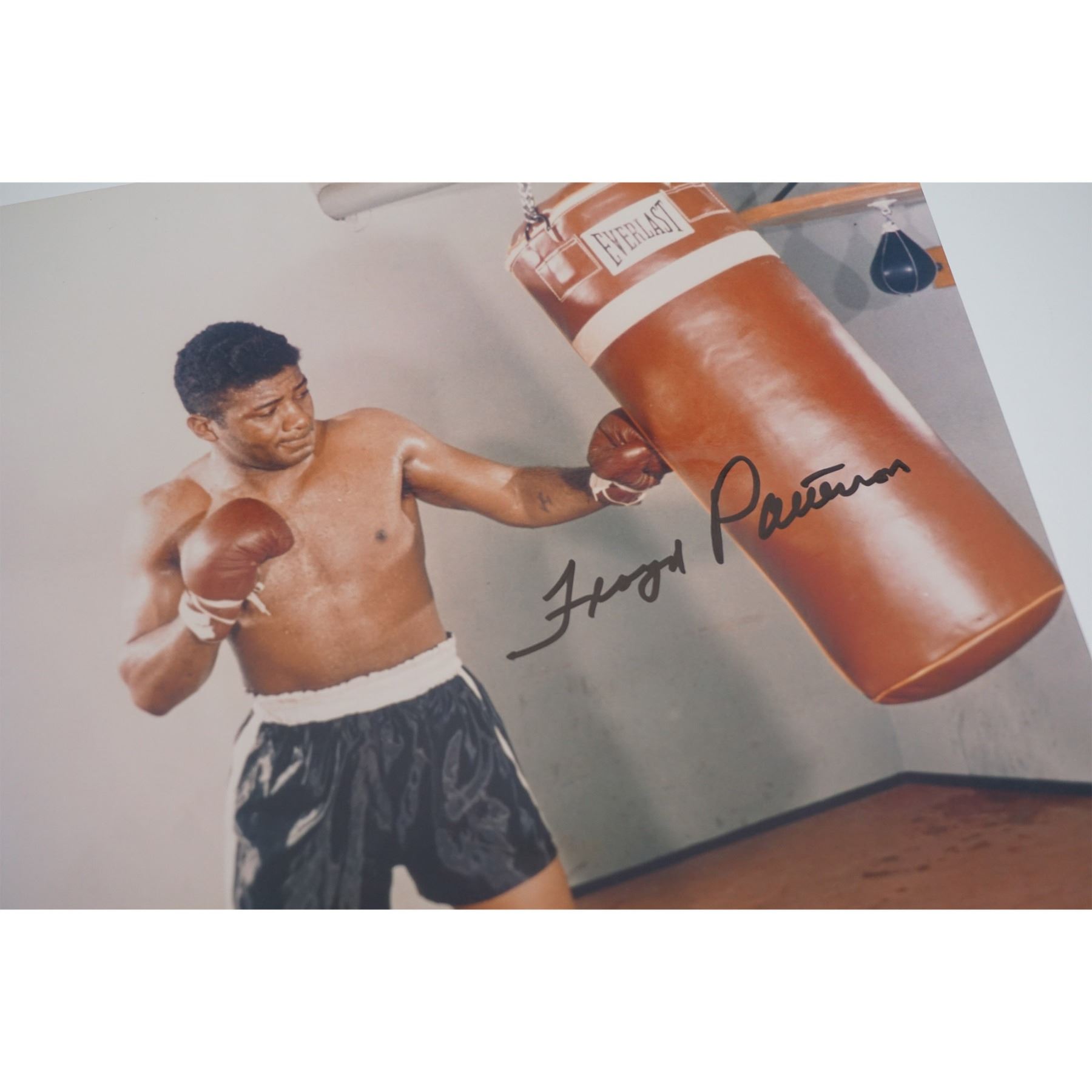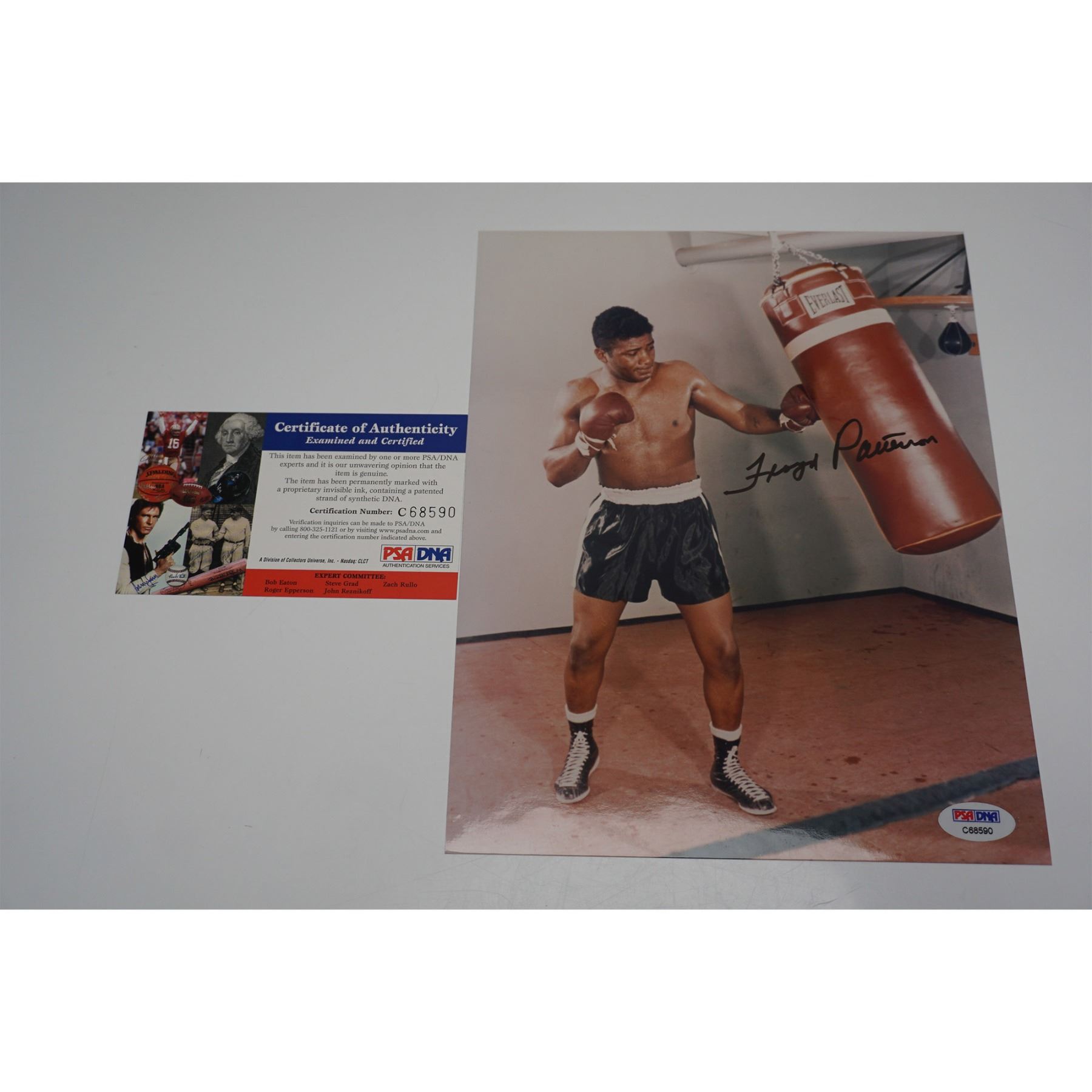 A striking autographed photograph of legendary heavyweight boxing champion Floyd Patterson. This image captures Patterson in an intense training session, delivering a punch to a suspended Everlast heavy bag. His bold signature is prominently displayed in black ink across the photograph. Accompanied by a PSA/DNA Certificate of Authenticity (COA) with verification number C68590, ensuring its authenticity. The PSA/DNA sticker is affixed to the lower corner of the photograph for additional verification. A must-have piece for boxing enthusiasts and sports memorabilia collectors.