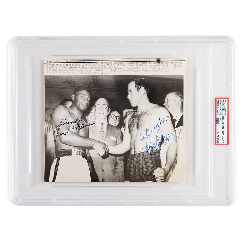 Original glossy 8 x 7 press photo of Patterson and Johansson weighing in before their 1960 championship bout, signed in blue and black ink, "Sincerely, Floyd Patterson" and "Best Wishes, Ingemar Johansson." In very good to fine condition, with trimmed edges, crazing to the emulsion,a and surface impressions from notations on the back. Encapsulated and graded by PSA/DNA as "NM-MT 8."