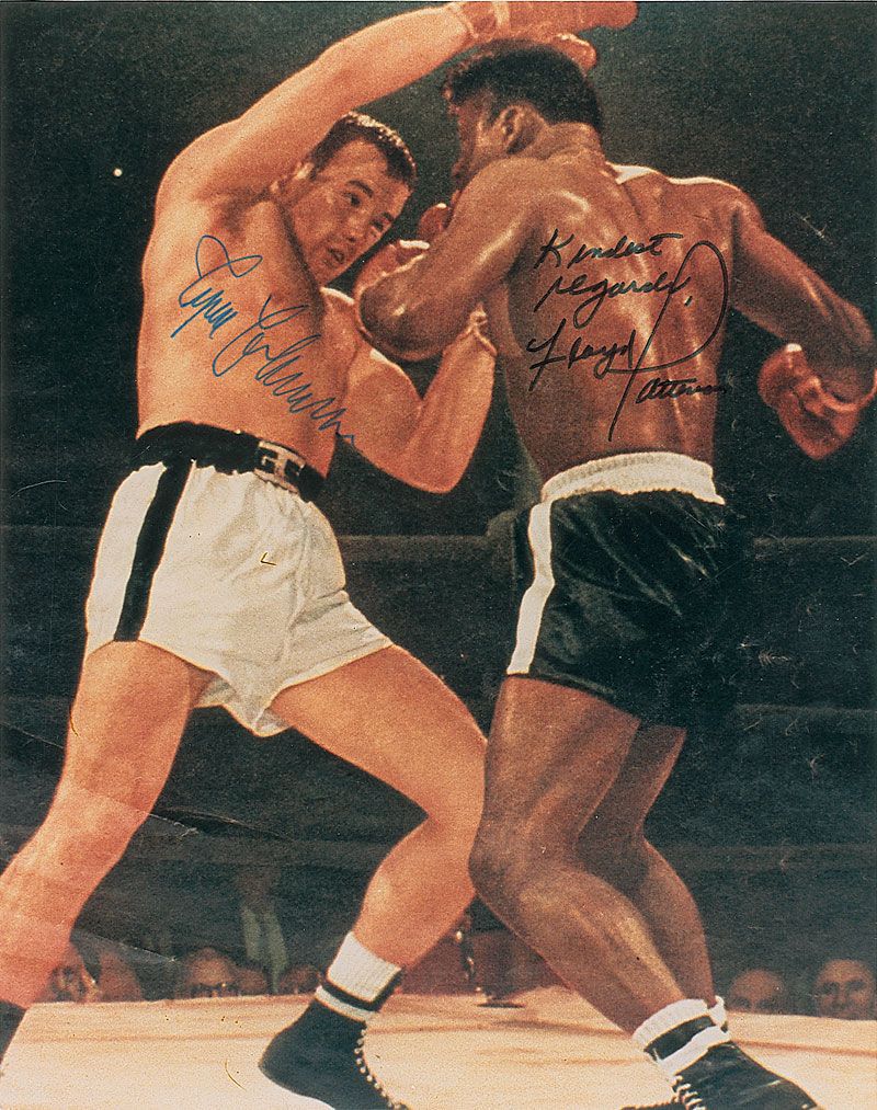 Color glossy 8 x 10 photo of the two battling in the ring, signed in black felt tip, “Kindest regards, Floyd Patterson,” and in blue felt tip “Ingemar Johansson.” In fine condition.