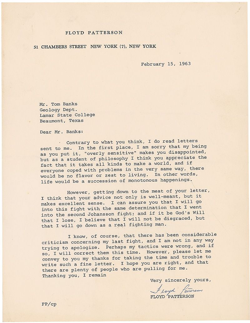 TLS, one page, 8.5 x 11, personal letterhead, February 15, 1963. Letter to an admirer prior to his fight with Sonny Liston. In part: “However, getting down to the meat of your letter, I think that your advice not only is well-meant, but it makes excellent sense. I can assure you that I will go into this fight with the same determination that I went into the second Johansson fight; and if it be God's Will that I lose, I believe that I will not be disgraced, but that I will go down as a real fighting man. I know, of course, that there has been considerable criticism concerning my last fight, and I am not in any way trying to apologize. Perhaps my tactics were wrong, and if so, I will correct them this time.” In fine condition, with intersecting folds and some scattered light creases. Patterson lost to Sonny Liston in September of 1962 and was widely criticized for not using his speed and trying to tie Liston up too frequently, which resulted in Patterson being knocked out on the first round. This quick result led some to speculate the fight was fixed to set up a lucrative rematch. Patterson was also knocked out in the first round of their rematch in July of 1963.