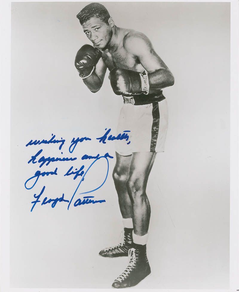 Glossy 8 x 10 photo of Patterson with his fists up, signed in blue felt tip, “Wishing you health, happiness and a good life, Floyd Patterson.” In fine condition.