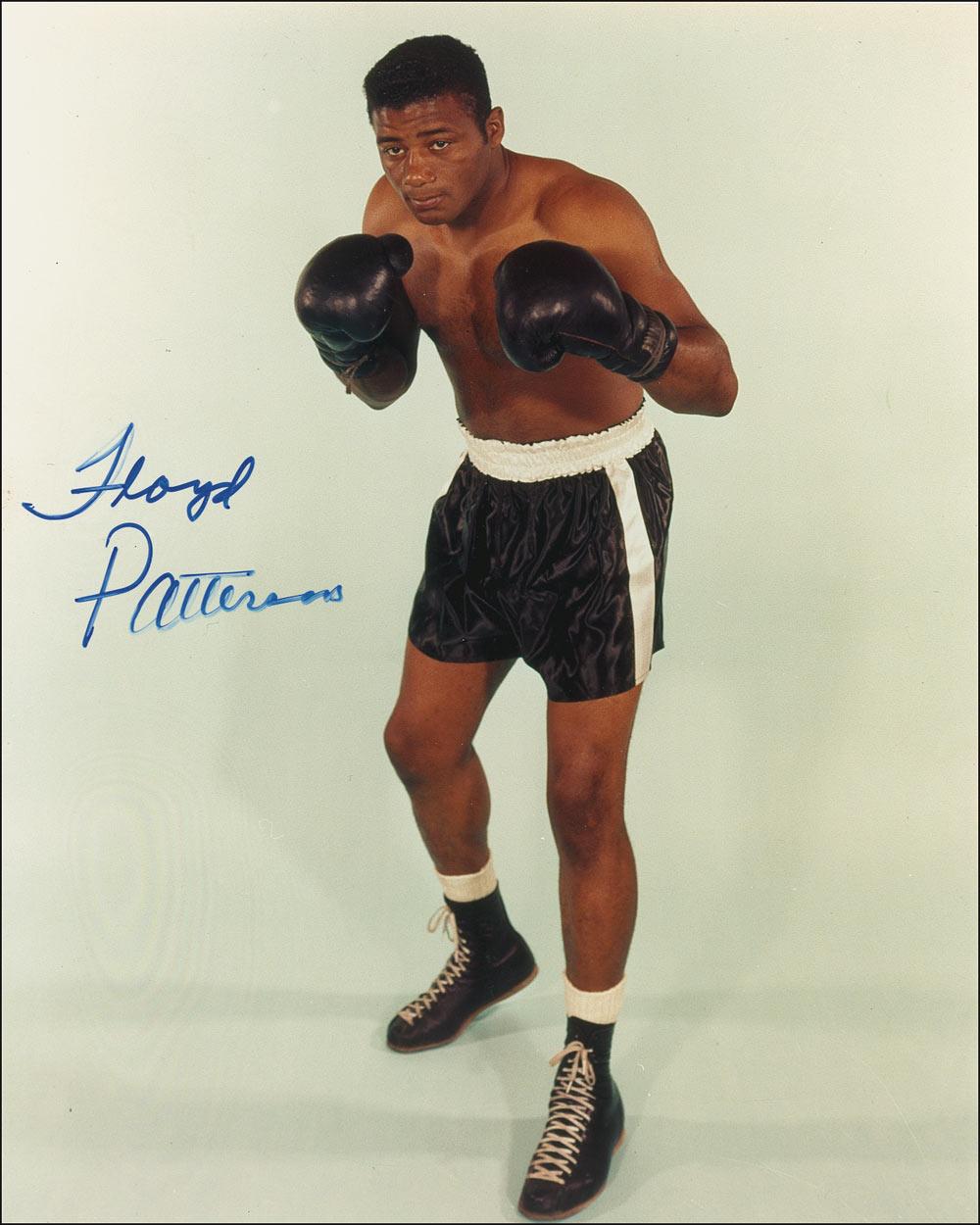 World Heavyweight boxing champion, 1956–59 and again 1960-62. Color glossy 8 x 10 photo of Patterson in a fighting stance, nicely signed in-person in blue felt tip. In very fine condition. Pre-certified Steve Grad/PSA/DNA and RRAuction COA.
