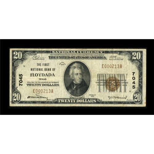 <B>Floydada, TX</B></I> - $20 1929 Ty. 1 <B>The First NB</B></I> Ch. # 7045<BR> O.M. Watson and J.V. Daniel piloted this bank. In May 2005 we sold a $10 in VF for $1150 on this scarce Floyd County bank. We expect this <B>Fine </B></I>$20 to weigh in somewhere in the neighborhood of...<BR><BR><b>Shipping:</b> Coins & Currency (<a target="_blank" href="http://www.heritageauctions.com/common/shipping.php">view shipping information</a>)