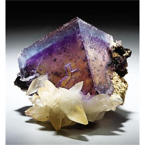 <B>FLUORITE WITH CALCITE</B></I><BR> <I>Minerva #1 Mine, Hardin County, Illinois</B></I><BR>From the now defunct Minerva #1 Mine comes this multi-colored masterpiece. The pale yellow core is surrounded by a layer of deep <BR>Violet which shades in turn, to an exquisite sky-blue. The fluorite cube is itself accented by a clean, sharp and undamaged group of calcite scalenohedrons to 1 inch or more in length. Tiny scattered pyrite cubes of a brassy hue are scattered over the surface of the yellow core producing a "phantom" layer below the complexly lustrous surface of this cubic jewel. <BR>There is a tiny nick to one corner of the cube otherwise the condition is excellent. The fluorite cube measures 2 x 1 7/8 inches.<BR><BR><b>Shipping:</b> Requires 3rd Party Shipping (<a target="_blank" href="http://www.heritageauctions.com/common/shipping.php">view shipping information</a>)