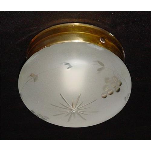 </font></strong>Circa 1930 A brass flashmount light fixture with wheel cut frosted glass lens.Diameter 6 3/4 " drop 4".</font>