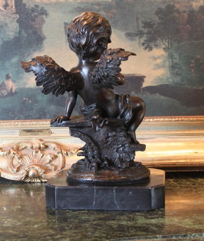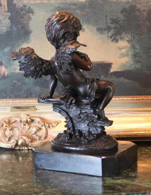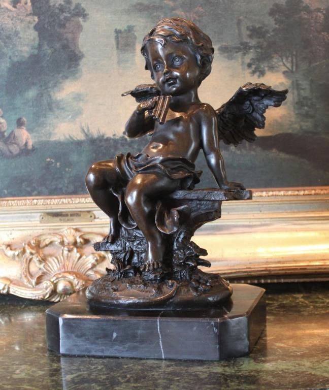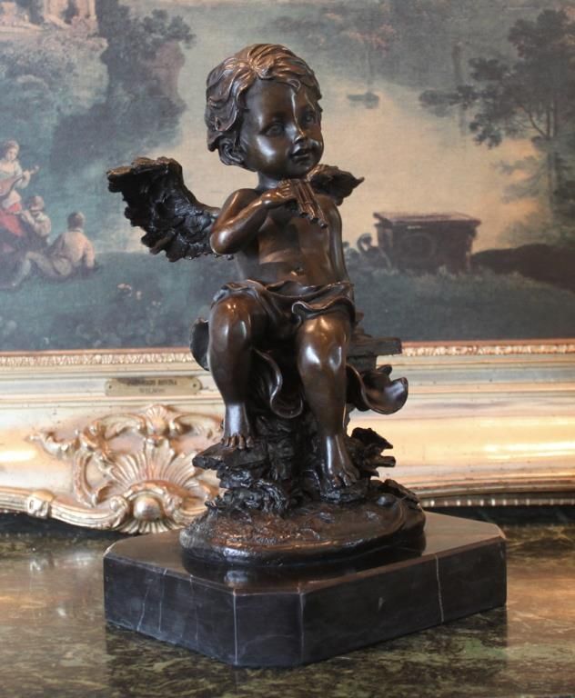 Flute Cherub Bronze Sculpture, 13h x 7.75w x 6.25d, 17 lbs. This bronze sculpture was produced using the "Lost Wax" casting method. The "Lost Wax" Cast method is the most precise metal casting technique in existence, ensuring exquisite detail of the original host model which is usually sculpted in clay or wax. This "Lost Wax" casting method is an extremely labor intensive and expensive process, but the end results produce a Heirloom Quality Masterpiece!