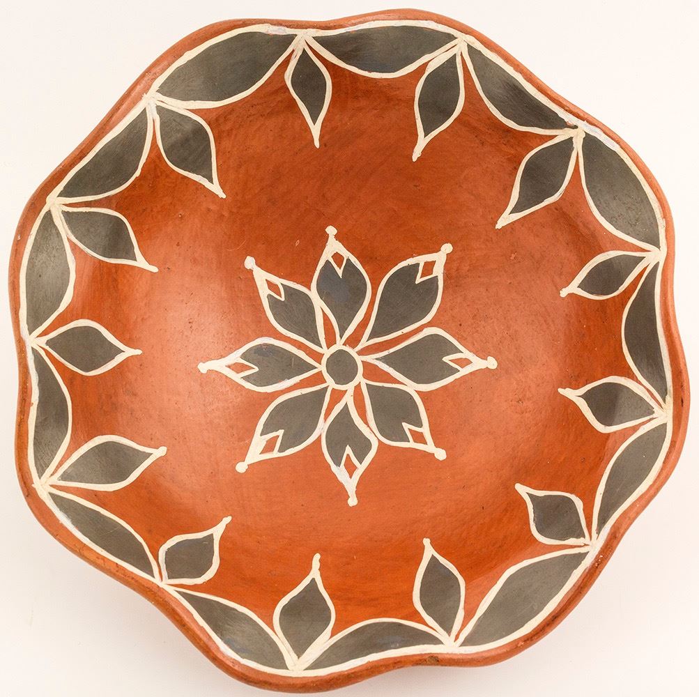 Fluted bowl, flower design. 3.75" h x 11.5" diameter. Unsigned. Older piece. Good condition. Date: Location: Santo Domingo Pueblo, New Mexico HWAC # 49350