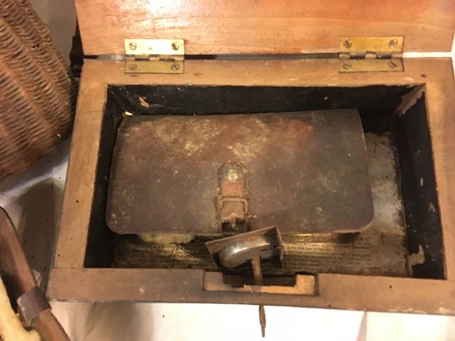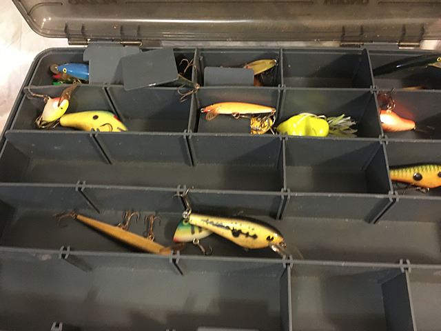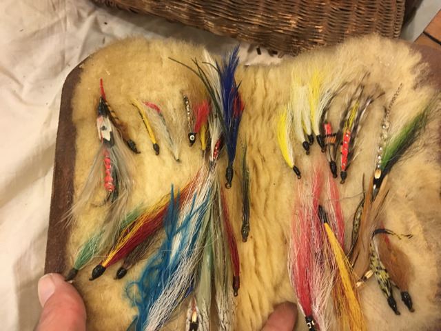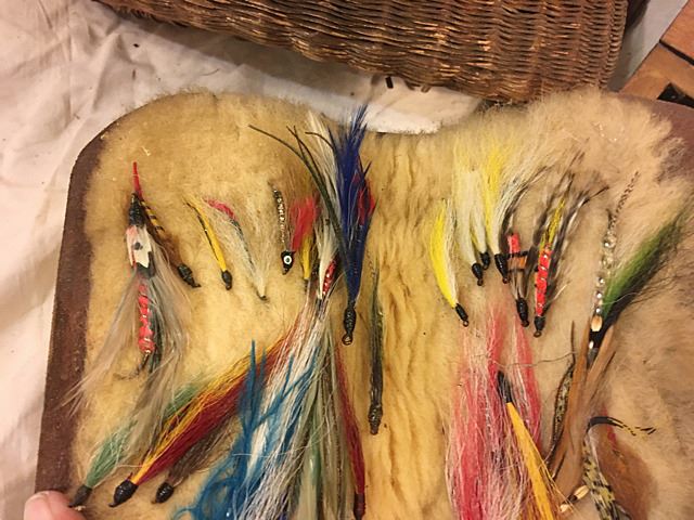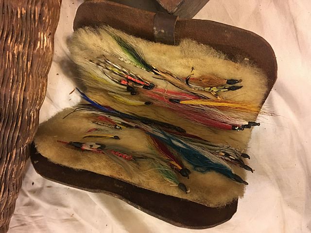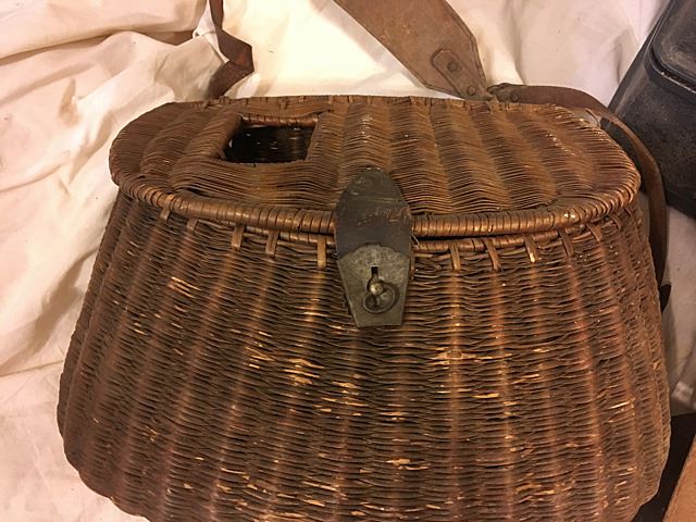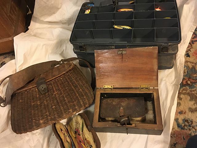 Fly fishing lot includes nice vintage fish basket, 2 leather fly lure wallets, box for fly lures, and tackle box.