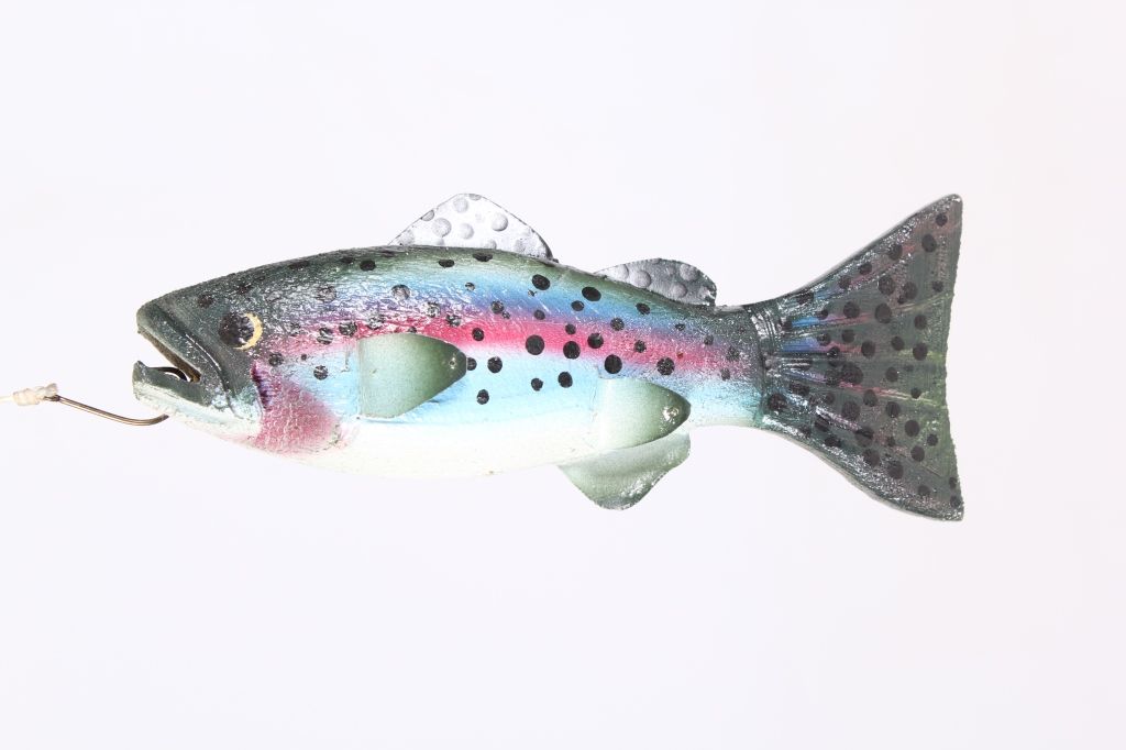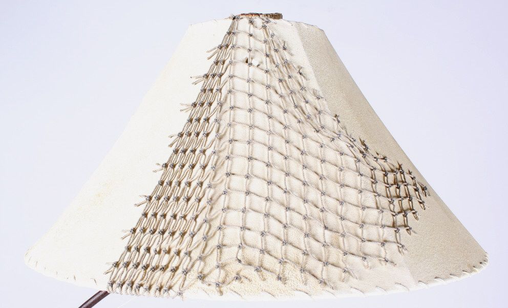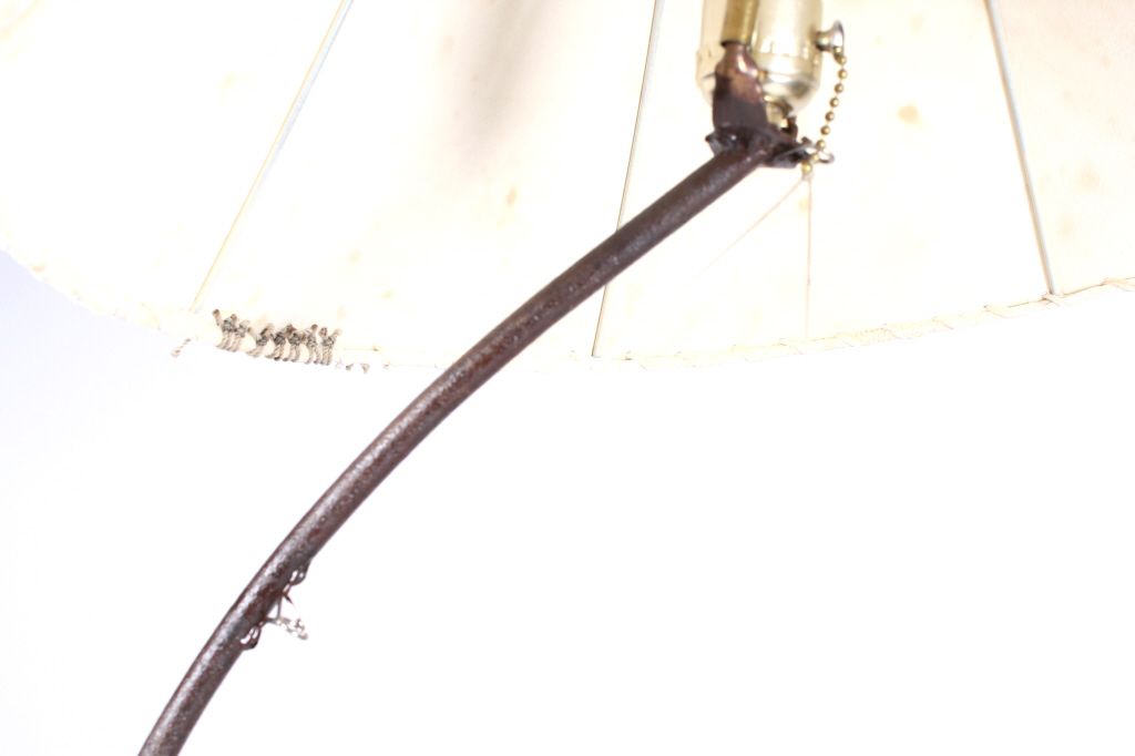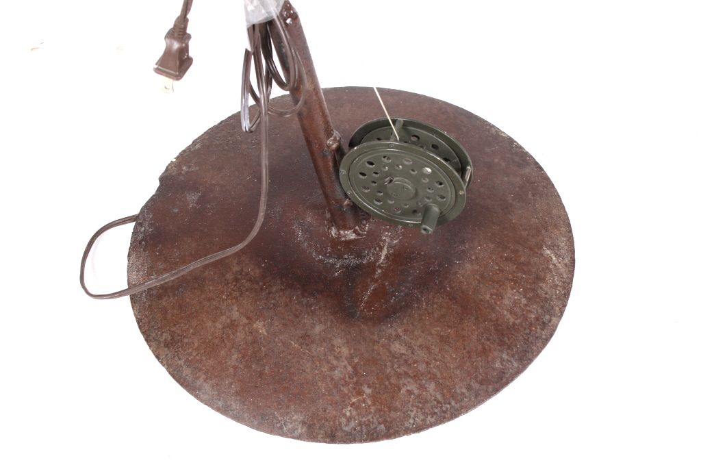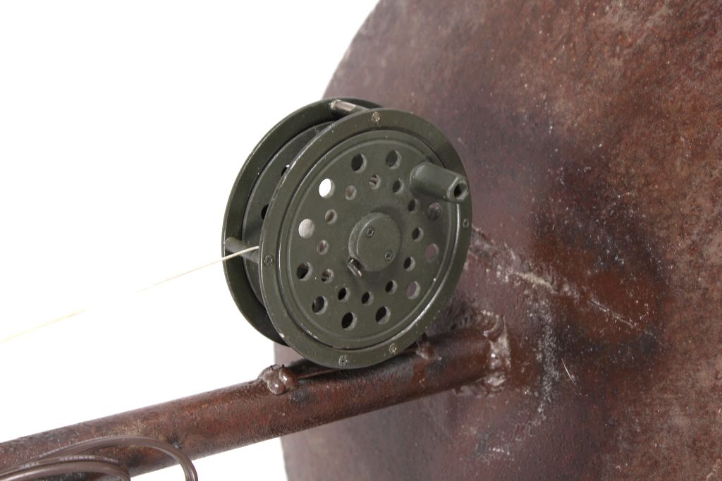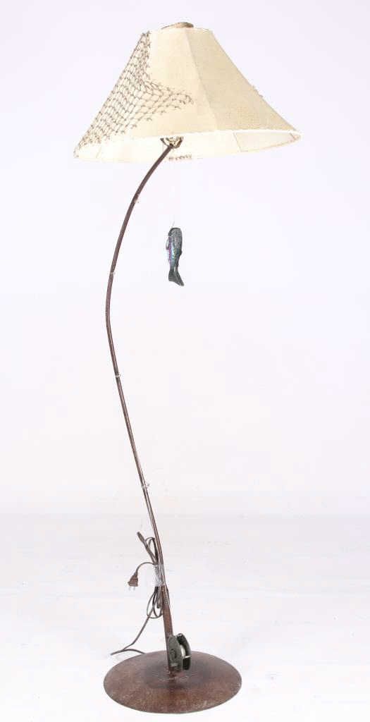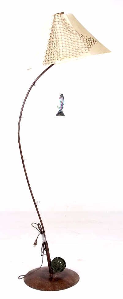 This is a hand made fly fishing floor lamp. The lamp shows a metal fly rod design with all the eyelets and a working antique reel. This also has a rawhide shade. Measures 20"w x 64"t