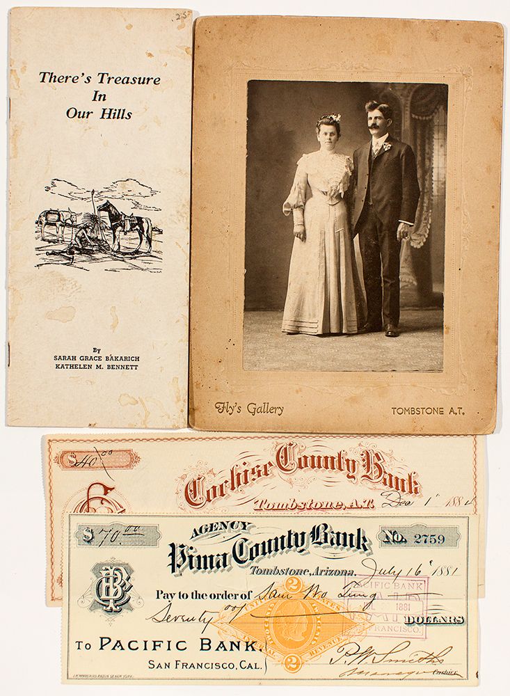 This is a great lot for any Tombstone collector! 1) Photograph of a couple taken at Fly’s Gallery. It measures5.55” x 3.90” and 8” x 6.10” on the matte. It has some surface wear. 2) Pacific Bank Check made out to Sau No Taug for $70 on July 16, 1881. 3) First National Bank check made out to Pascal Dubedat on December 1, 1884 for $40. 4) “There’s Treasure in our Hills” booklet. It was written by Sarah Grace Bakarich and Kathleen M. Bennett , it was published in 1947 and has 16 pages. Bud Bassett Collection - HKA#65453