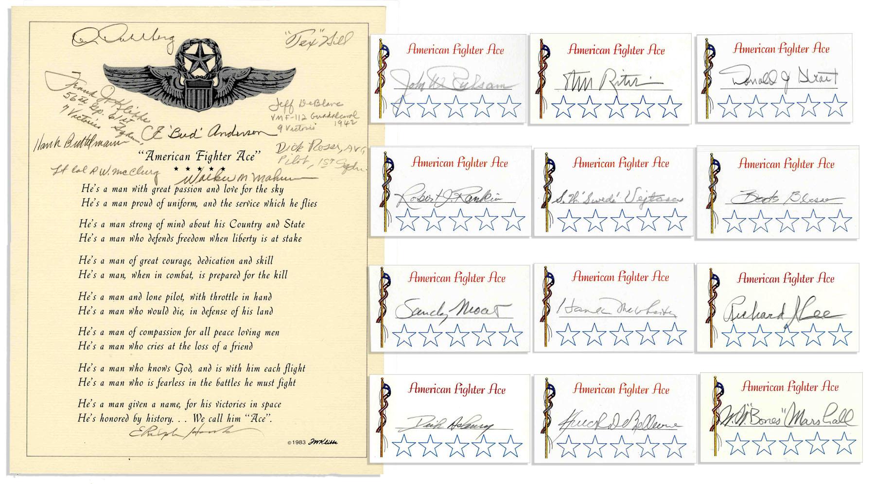 Flying Ace lot which includes: (1) 12 ''American Fighter Ace'' 3.5'' x 2'' cards, signed by Chuck DeBellevue, Richard Lee, Boots Blesse, Bones Marshall, Sandy Moats, Hamilton McWhorter, Steve Ritchie, Robert Rankin, Donald Strait, John Ruhsam, Swede Vejtasa and Dick Asbury; (2) Printed 8'' x 10'' poem entitled ''American Fighter Ace'' signed by its author, Ace Frank Klibbe and also by Ken Dahlberg, Hank Buttlemann, Bud Anderson, Tex Hill, Jeff DeBlanc, Dick Rossi, R.W. McClurg, Walker Mahurin and E.R. Hanks. All signatures in pencil. Fine.