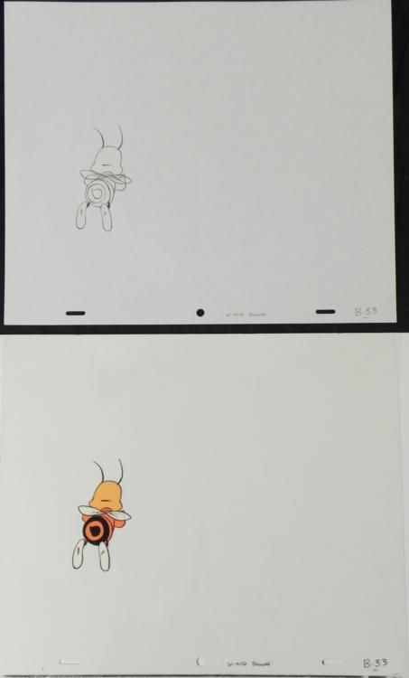 Flying Away! Original Animation Cel & Drawing Medium: Hand painted acetate cel Details: Animation notations and peg holes Original "rough" animation drawing, in non-photo blue and black pencil Size of cel: 10 1/2 x 12 1/2 inches Size of drawing: 10 1/2 x 12 1/2 inches Condition: Very goodThis is an original hand-painted cel set-up used in the production of the "Cheerios commercial." Each one-of-a-kind set-up represents a slight change in position of the characters. When individually photographed and projected in rapid succession, the images appear to move. To created production cels, the original animator's drawing is transferred onto an acetate cel (by hand-inking and/or photo copying). The cel is then hand-painted on the reverse side.