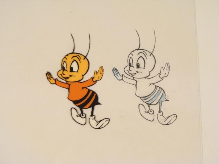 Here, it appears that Buzz is flying. This is an original animation cel & drawing from the production of the Cheerios cereal commercial.Medium: Hand painted acetate cel with drawingCel size: 10 1/2 x 12 1/2 inchesDrawing size: 10 1/2 x 12 1/2 inchesDetails: Number and peg holes at the bottom edgeCondition: Very goodPencil color: non-photo blue and black