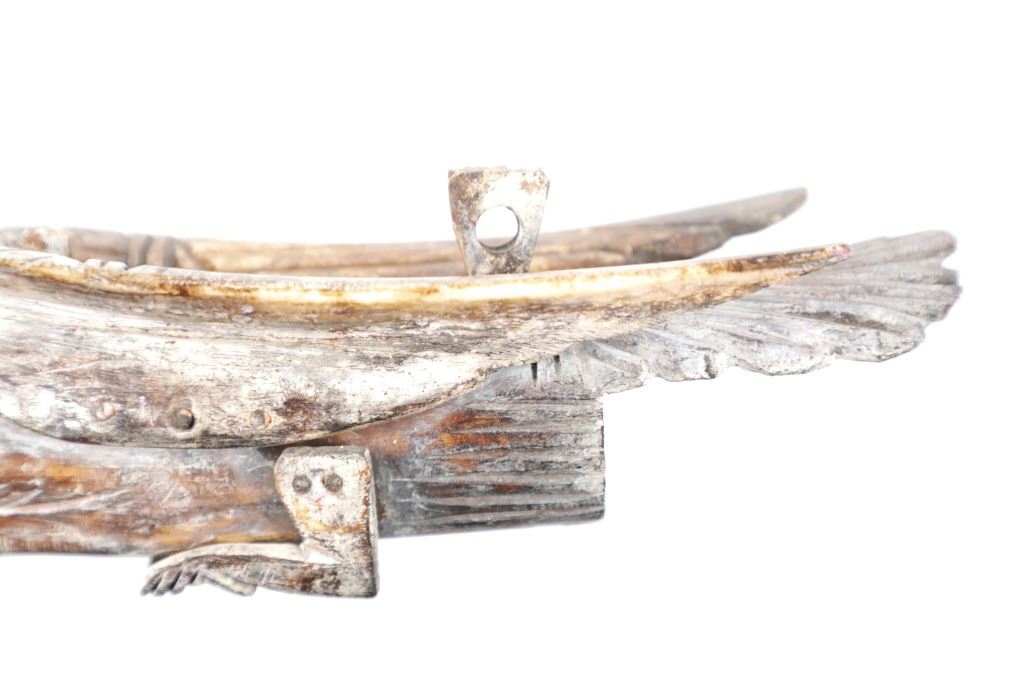 Featured in this lot is this flying bone carved thunderbird effigy circa 1940's. The thunderbird features a wonderfully and professionally crafted bone construction that shows a tacked together thunderbird in flight with natural dyes to it that shows a hand carved design with a flying body with wings and legs with a cylindrical body. The condition of this bone thunderbird is good with some fading to the paint on the bon structure, but otherwise is in good overall condition. The measurements of this figure is 7 5/8" x 2 1/4" x 2 1/2". The collective weight of this figure is U6oz.