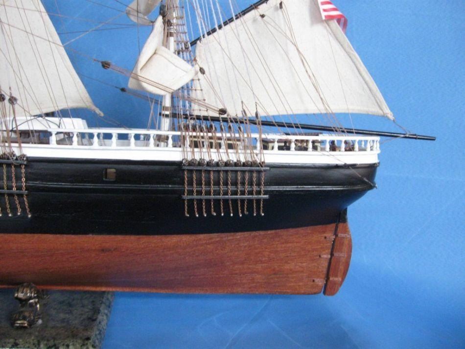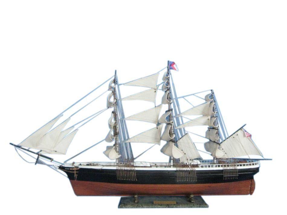 Museum-quality features and finely-crafted details capture the spirit and pride of the Flying Cloud in this Limited Edition scale replica tall ship model. With devoted attention to historical accuracy, every detail on the Flying Cloud authentically matches the famous clipper ship. Serving as the centerpiece of a meeting room, office, or den, or perhaps setting a proud nautical tone for a corporate boardroom or family living room, these Limited Edition model tall ships are certain to inspire an indomitable winning spirit. Built from scratch over hundreds of hours by master artisans High-quality woods include cherry, birch, maple, and rosewood Individual wooden planks used in plank-on-frame hull construction Museum Quality features not available in other model tall ships under $3,000 or any kit Higher quality woods used in construction Greatest attention paid to every detail 500% more rigging than 20” tall ship models, featuring over 200 blocks and deadeyes Largest size replica allows maximum detailing of features including: Additional deck items Highly complex rigging Increased scale accuracy Many other quality enhancements Other Amazing Details including: Planked deck with nail holes Authentic scale lifeboats Brass rails and other deck accessories Finely crafted and highly detailed deckhouses Larger deck allows for more items and finer details Masterfully stitched, heavy canvas sails hold shape and do not wrinkle Taut rigging with varied thread gauge and color Meticulous painting accurately matches the actual Flying Cloud Wooden display base features four arched dolphins Pictured with marble base (available for purchase) Extensive research of original plans, historical drawings, paintings, and actual photographs ensures the highest possible accuracy