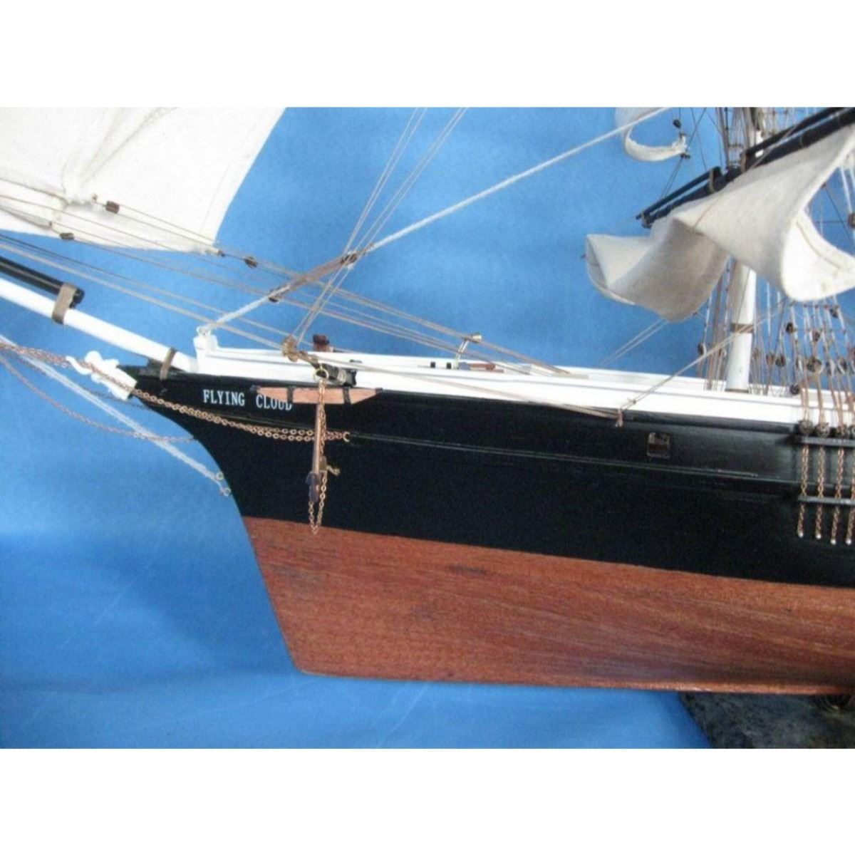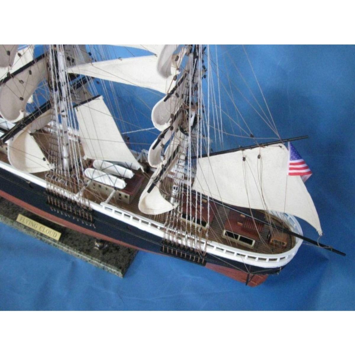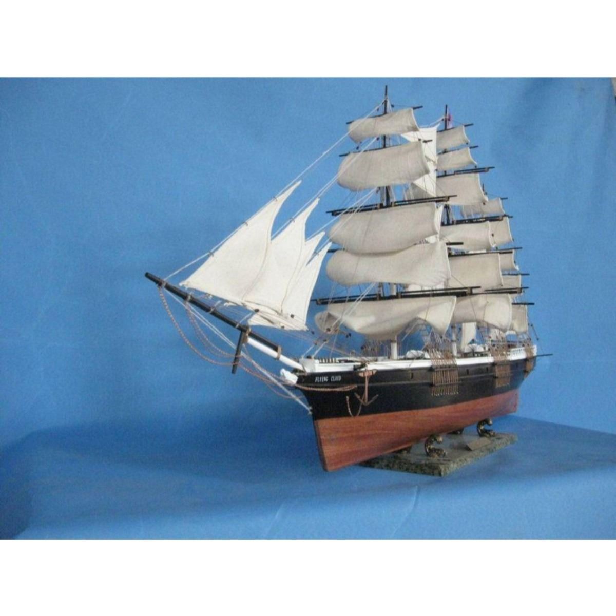 Museum-quality features and finely-crafted details capture the spirit and pride of the Flying Cloud in this Limited Edition scale replica tall ship model. With devoted attention to historical accuracy, every detail on the Flying Cloud authentically matches the famous clipper ship. Serving as the centerpiece of a meeting room, office, or den, or perhaps setting a proud nautical tone for a corporate boardroom or family living room, these Limited Edition model tall ships are certain to inspire an indomitable winning spirit.  Built from scratch over hundreds of hours by master artisans High-quality woods include cherry, birch, maple, and rosewood Individual wooden planks used in plank-on-frame hull construction Museum Quality features not available in other model tall ships under $3,000 or any kit Higher quality woods used in construction Greatest attention paid to every detail 500% more rigging than 20†tall ship models, featuring over 200 blocks and deadeyes Largest size replica allows maximum detailing of features including: Additional deck items Highly complex rigging Increased scale accuracy Many other quality enhancements Other Amazing Details including: Planked deck with nail holes Authentic scale lifeboats Brass rails and other deck accessories Finely crafted and highly detailed deckhouses Larger deck allows for more items and finer details Masterfully stitched, heavy canvas sails hold shape and do not wrinkle Taut rigging with varied thread gauge and color Meticulous painting accurately matches the actual Flying Cloud Wooden display base features four arched dolphins Pictured with marble base (available for purchase) Extensive research of original plans, historical drawings, paintings, and actual photographs ensures the highest possible accuracy