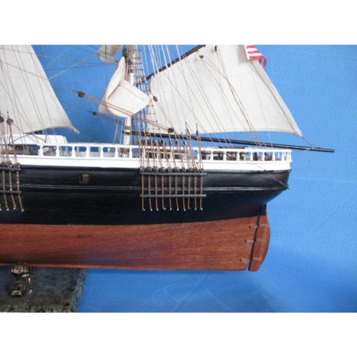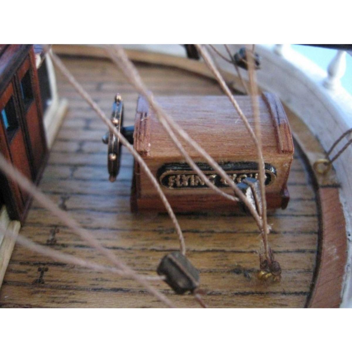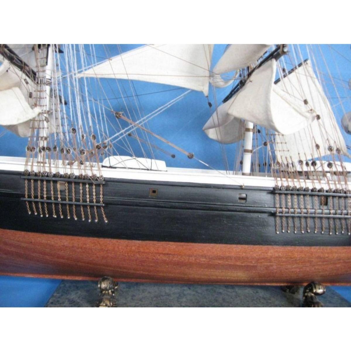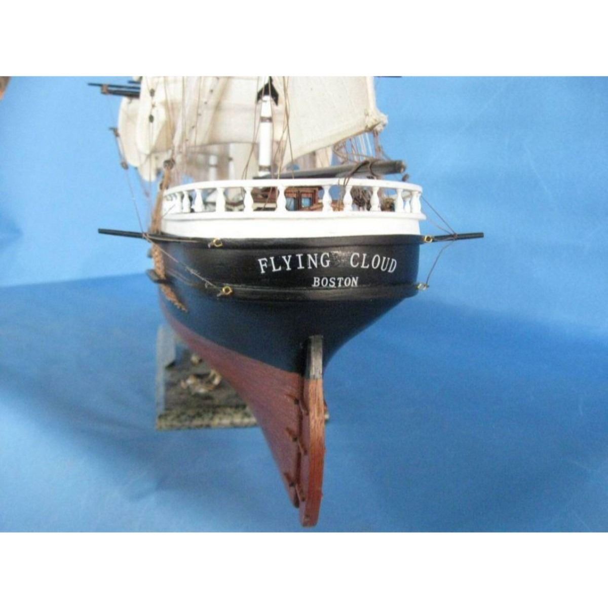 Museum-quality features and finely-crafted details capture the spirit and pride of the Flying Cloud in this Limited Edition scale replica tall ship model. With devoted attention to historical accuracy, every detail on the Flying Cloud authentically matches the famous clipper ship. Serving as the centerpiece of a meeting room, office, or den, or perhaps setting a proud nautical tone for a corporate boardroom or family living room, these Limited Edition model tall ships are certain to inspire an indomitable winning spirit.  Built from scratch over hundreds of hours by master artisans High-quality woods include cherry, birch, maple, and rosewood Individual wooden planks used in plank-on-frame hull construction Museum Quality features not available in other model tall ships under $3,000 or any kit Higher quality woods used in construction Greatest attention paid to every detail 500% more rigging than 20†tall ship models, featuring over 200 blocks and deadeyes Largest size replica allows maximum detailing of features including: Additional deck items Highly complex rigging Increased scale accuracy Many other quality enhancements Other Amazing Details including: Planked deck with nail holes Authentic scale lifeboats Brass rails and other deck accessories Finely crafted and highly detailed deckhouses Larger deck allows for more items and finer details Masterfully stitched, heavy canvas sails hold shape and do not wrinkle Taut rigging with varied thread gauge and color Meticulous painting accurately matches the actual Flying Cloud Wooden display base features four arched dolphins Pictured with marble base (available for purchase) Extensive research of original plans, historical drawings, paintings, and actual photographs ensures the highest possible accuracy