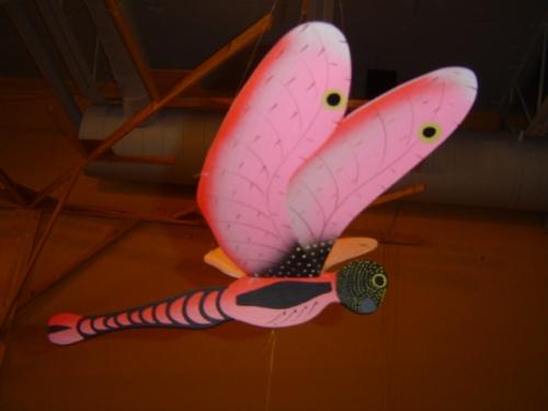 Suspend your dragonfly from a ceiling or verand and watch it flap lazily with the slightest touch or gentle breeze, hand-painted wood. 21" Wingspan