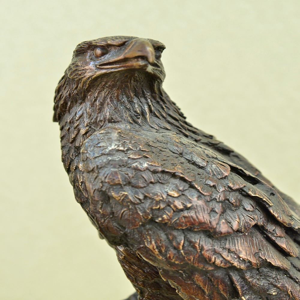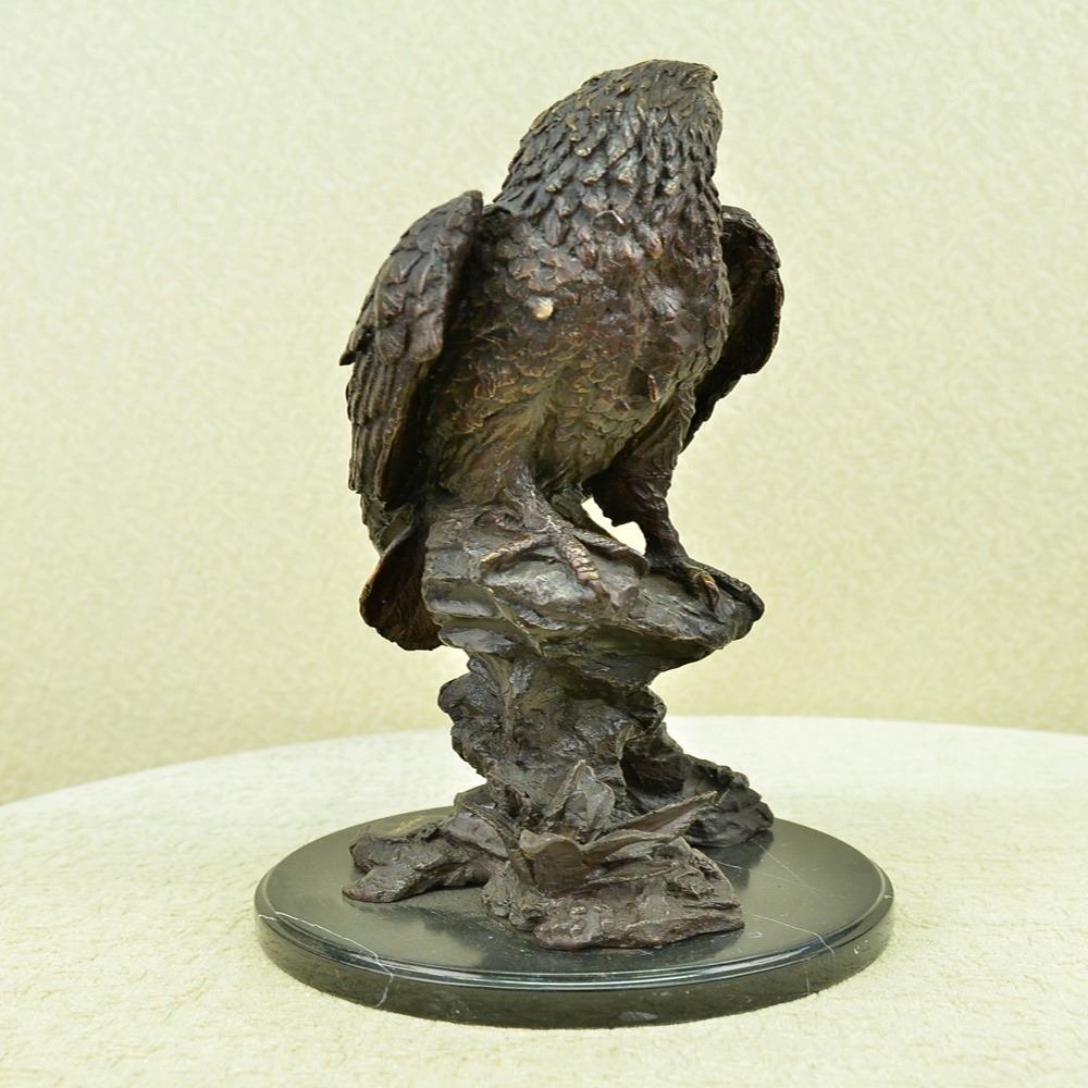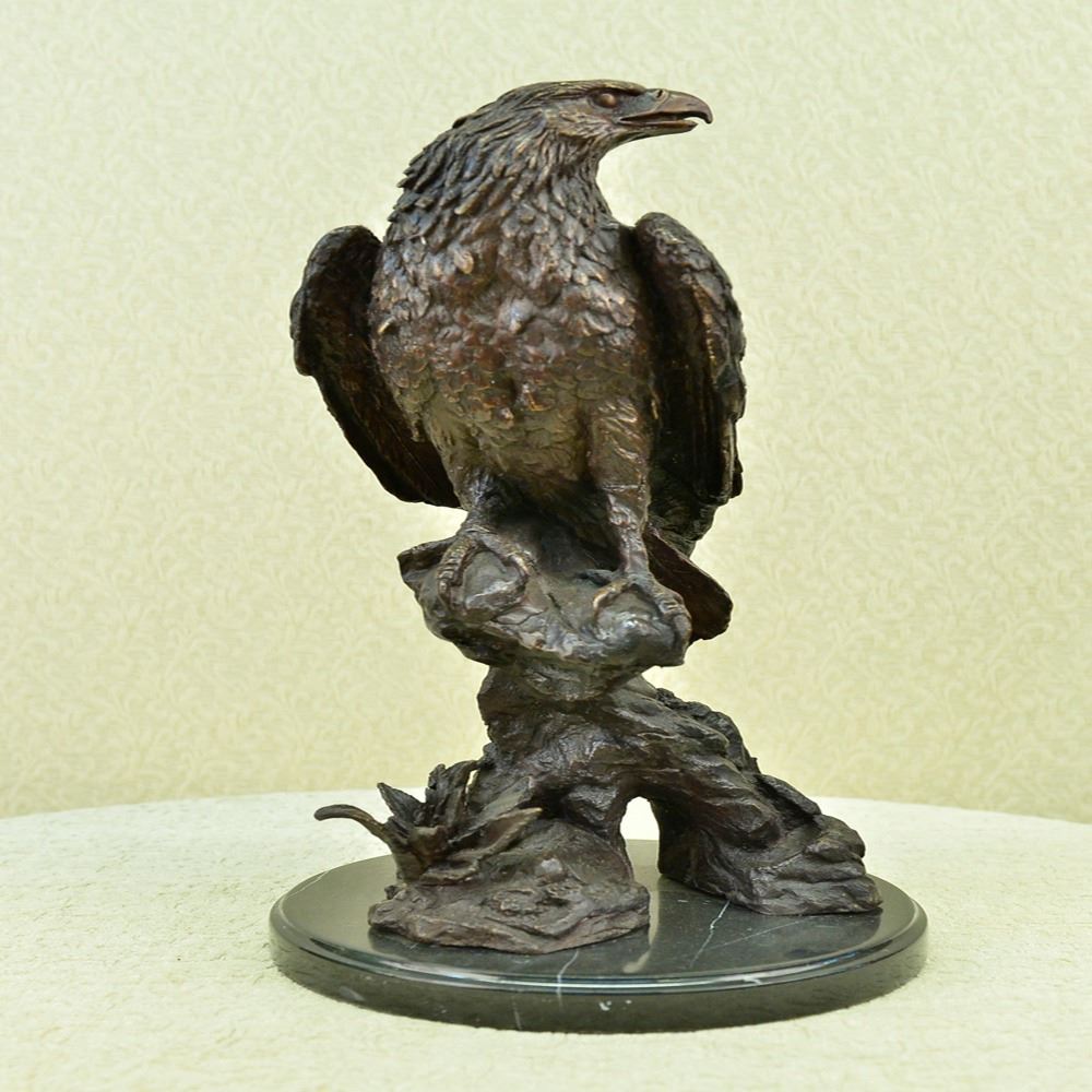 This is a beautifully detailed Sculpture of the American bald Eagle. He rests upon a common perch and looks over his shoulder, his beak slightly opened ready to release a loud squawk. The detail on his face, neck feathers and body are brilliantly detailed and makes the bird look extremely realistic as he sits. His claws grasp onto a solid rock with a plant growing beneath it, its talons are sharp and penetrating. He is a magnificent recreation of this power creature and the National symbol of the United State of America. He represents resilience, power and strength but mostly it represents Freedom. Handmade of 100% Bronze and cast using the ancient Lost Wax Method and its atop a marble base. Bronze Dimensions with Marble Base: Height 18 X Width 9 inches. Weight: 22 LBS.