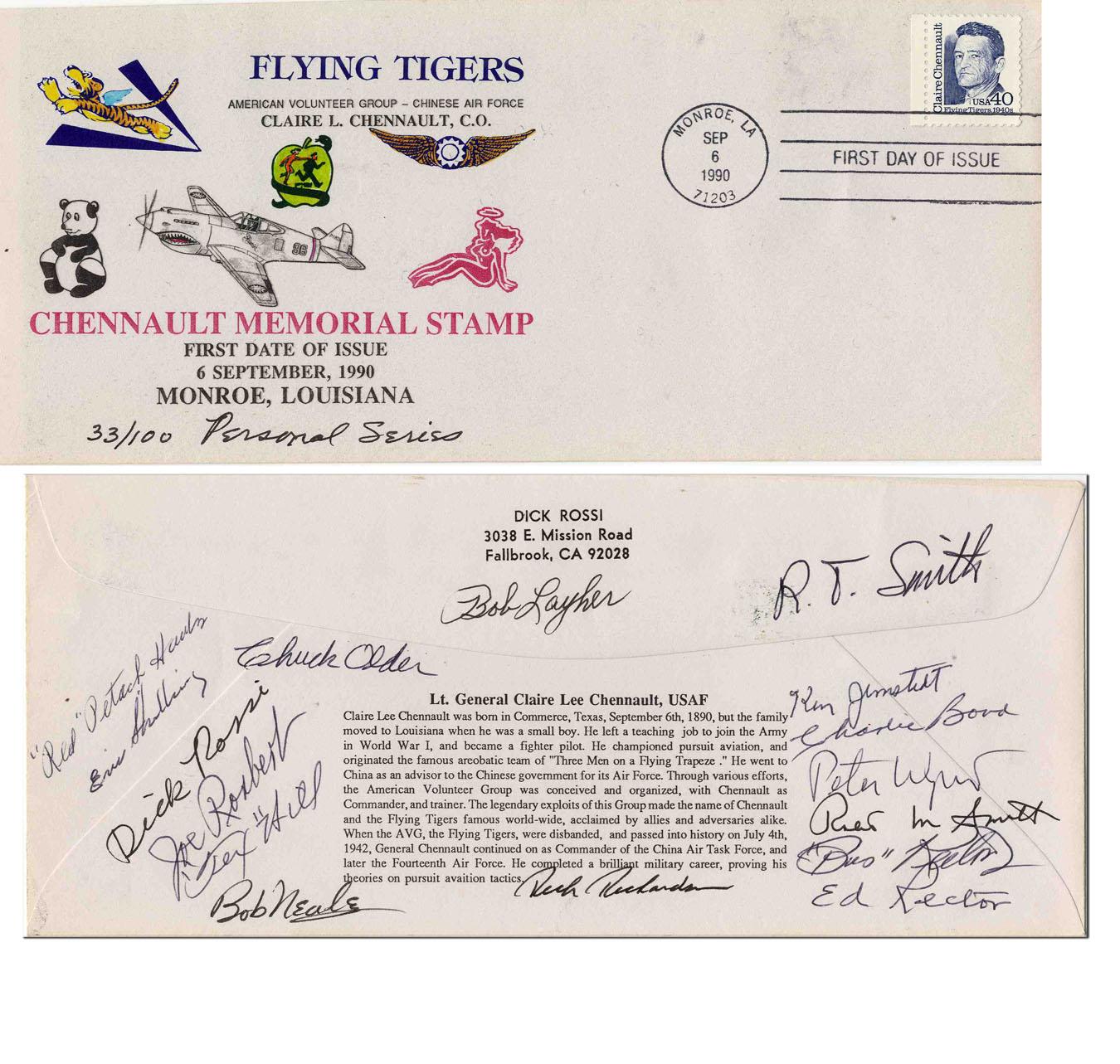 Limited edition (#33 of 100) first day cover issued on 6 September 1990, honoring General Claire Chennault and signed by 16 of his WWII Flying Tigers. Signed on verso by ''Red'' Petach Hanks, Erik Shilling, Dick Rossi, Joe Rosbert, Tex Hill, Bob Neale, Chuck Older (also the Judge in the Charles Manson murder trials), Bob Layher, Rich Richardson, R.T. Smith, Ken Jernstedt, Charlie Bond, Peter Wright, Robert Smith, ''Bus'' Keeton and Ed Rector. Cover measures 9.5'' x 4'' and is accompanied by COA additionally signed by Dick Rossi. Fine.