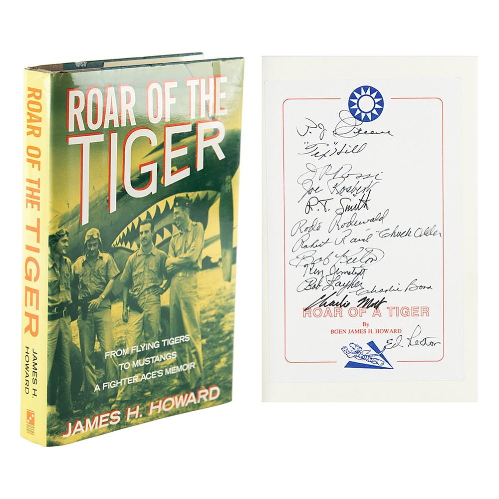 Signed book: Roar of the Tiger by James H. Howard. First edition. NY: Orion Books, 1991. Hardcover with dust jacket, 6.25 x 9.25, 310 pages. Signed in black ink or felt tip on a bookplate affixed to the first free end page by 14 Flying Tigers, including: Tex Hill, Ken Jernstedt, Charles Mott, Bob Keeton, Robert Raine, Rode Rodewald, Robert T. Smith, Bob Layher, Joe Rosbert, Dick Rossi, Paul J. Greene, Chuck Older, Charlie Bond, and Ed Rector. In fine condition.