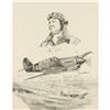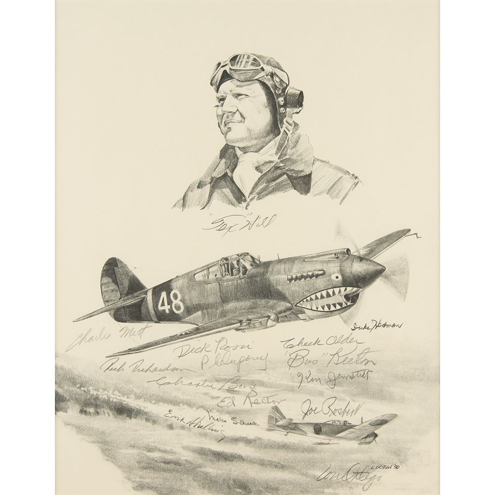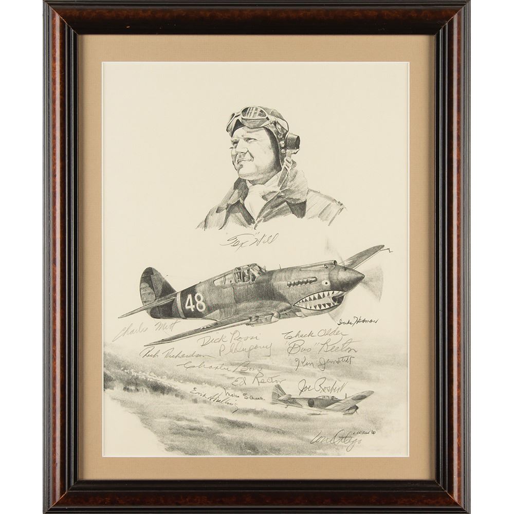 Appealing 10.25 x 13.5 print of a Lonnie Ortega drawing of Brigadier General David Lee ‘Tex’ Hill and his Flying Tigers aircraft, signed in pencil by Hill, Charlie Bond, Chuck Older, Charlie Mott, Bus Keelin, Ed Rector, Joe Rosbert, Rich Richardson, Ken Jernstedt, Dick Rossi, Erik Shilling, Duke Hedman, and one other. The print is also signed by the artist. Matted and framed to an overall size of 14.75 x 17.75. In fine condition.