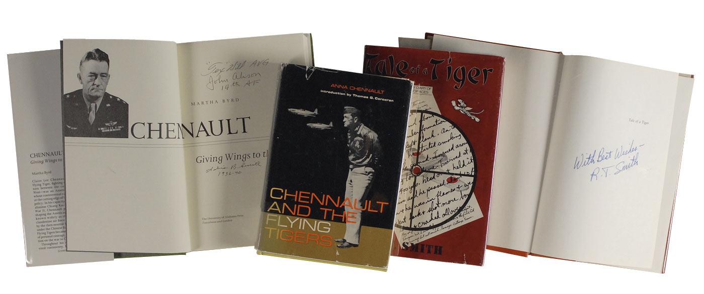 Four hardcover books: Chennault: Giving Wings to the Tigers, signed by three including ’Tex’ Hill; two copies of Tale of a Tiger, both signed by R. T. Smith; and Chennault and the Flying Tigers, signed by Anna Chennault. In fine overall condition.