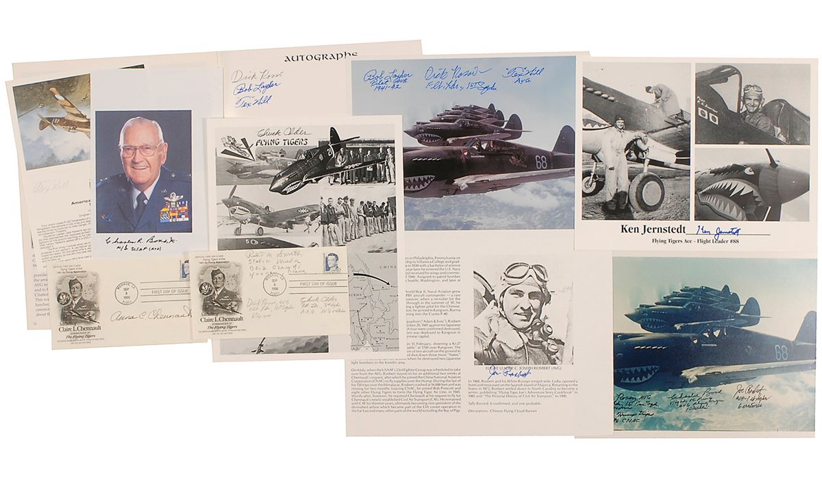 Ten items consisting of various size photos, FDCs, cards, and a program, each signed in ink or felt tip by members of the Flying Tigers, with several of the items signed by more than one member. Signers are: Robert Smith, Chuck Older (2), Charlie Bond (2), Tex Hill (2), Dick Rossi (3), Joe Rosbert (2), Bob Layher, and Ken Jernstedt. In fine condition.