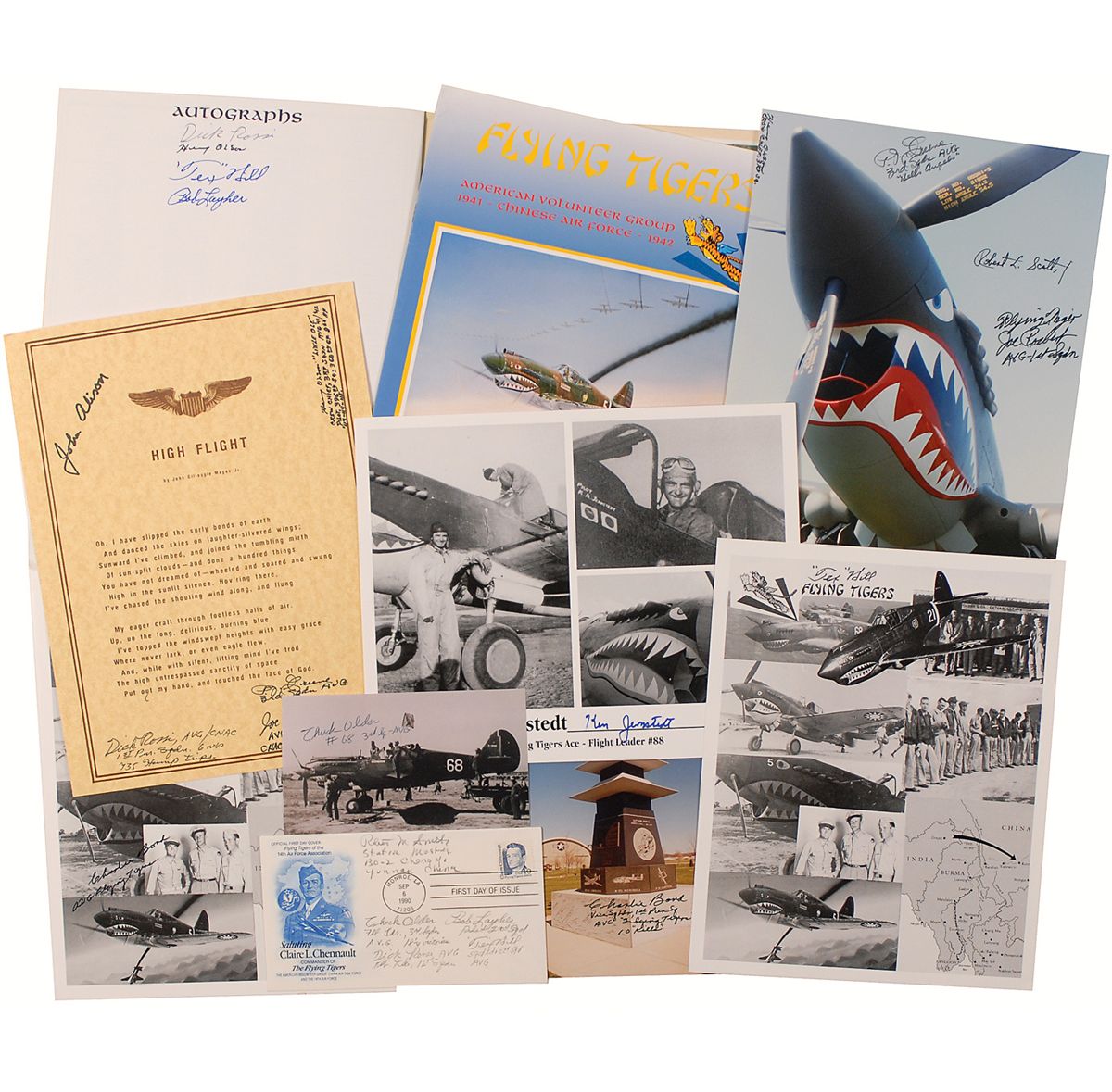 Ten items consisting of booklets, various size photos, and an FDC, each signed by members of the Flying Tigers. Items are: 1993 reunion booklet signed by Dick Rossi, Bob Layher, and Tex Hill; 1995 reunion booklet signed by Dick Rossi, Henry Olson, Tex Hill, and Bob Layher; and FDC signed by Robert Smith, Chuck Older, Bob Layher, Dick Rossi, and Tex Hill; and photos signed by Tex Hill, Charlie Bond, Ken Jernstedt, P. J. Greene, Robert L. Scott, Jr., Joe Rosbert, Henry Olson, John Alison, Dick Rossi, Chuck Older, and Charlie Bond. In fine condition.