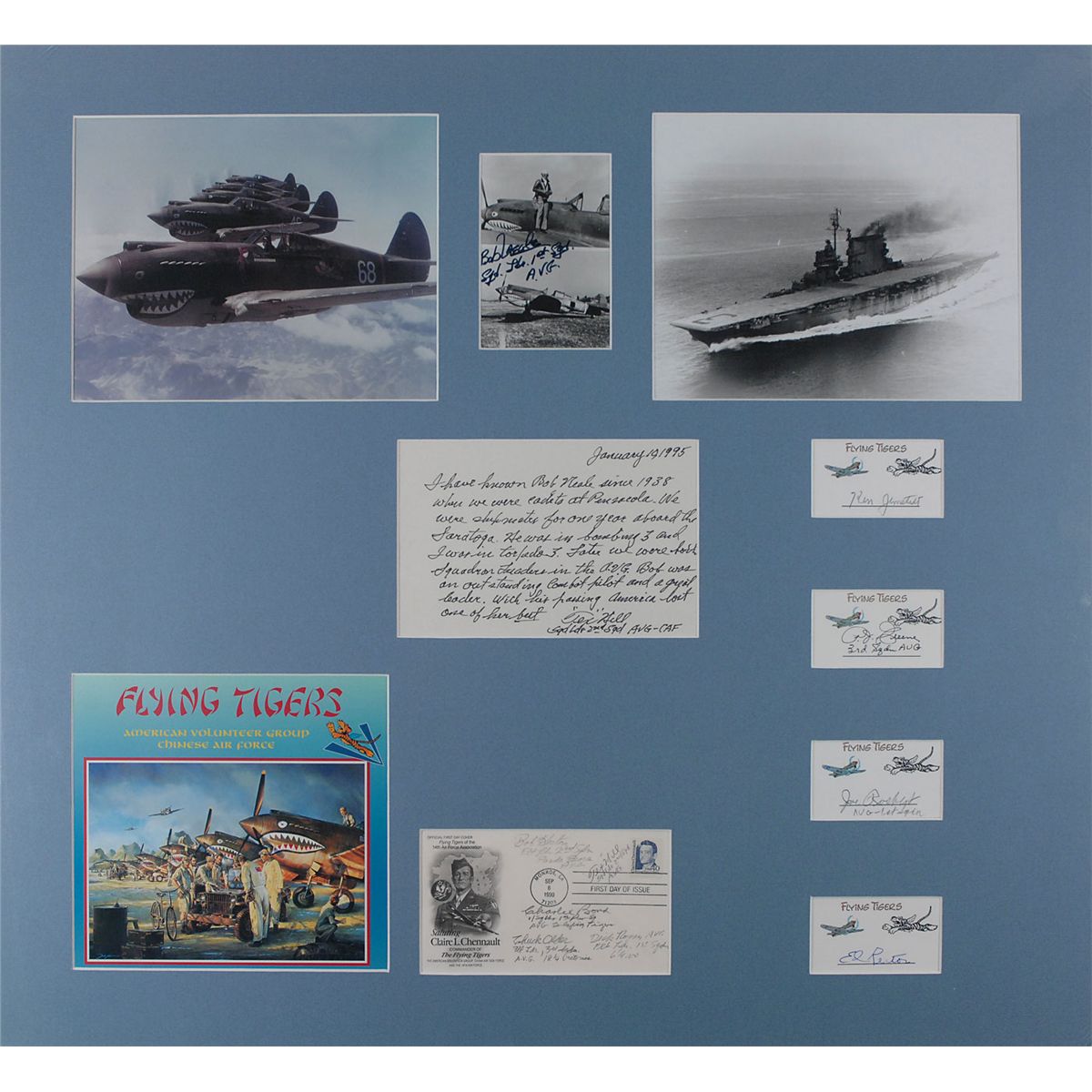 Seven items: an ALS signed “Tex Hill,” one page, 7.5 x 4.75, January 10, 1995, describing his experience with Bob Neale and the Flying Tigers; a glossy 3.25 x 4.75 photo of Bob Neale with his plane, signed in black felt tip; an FDC with a cachet honoring Claire L. Chennault, signed in pencil by Tex Hill, Bob Keeton, Charlie Bond, Chuck Older, and Dick Rossi; and ink and pencil signatures of Ken Jernstedt, P. J. Greene, Joe Rosbert, and Ed Rector on individual white 3.25 x 1.75 cards. Matted together to an overall size of 28 x 25. In overall fine condition. Oversized.