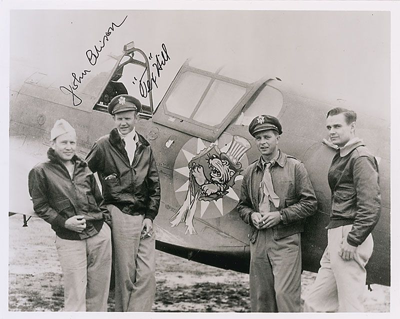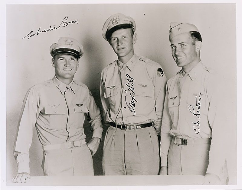 Two glossy 10 x 8 photos of different crews and pilots, one signed in black felt tip by Charlie Bond, Tex Hill, and Ed Rector; the other signed in black felt tip by John Alison and Tex Hill. In fine condition.