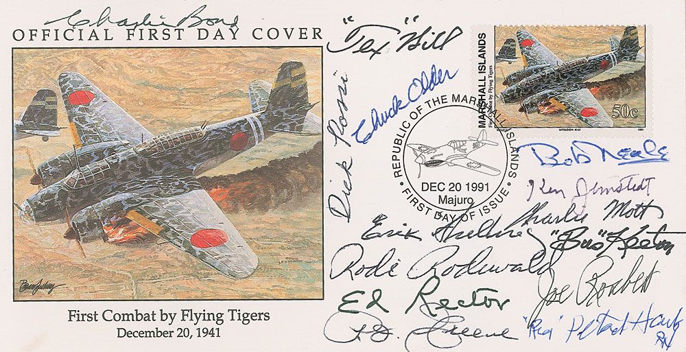 FDC with a cachet honoring the first combat by the Flying Tigers, signed in ink and felt tip by 14 members including ‘Tex’ Hill, Dick Rossi, Chuck Older, Charlie Bond, Ed Rector, Joe Rosbert, and Charlie Mott. In very fine condition.