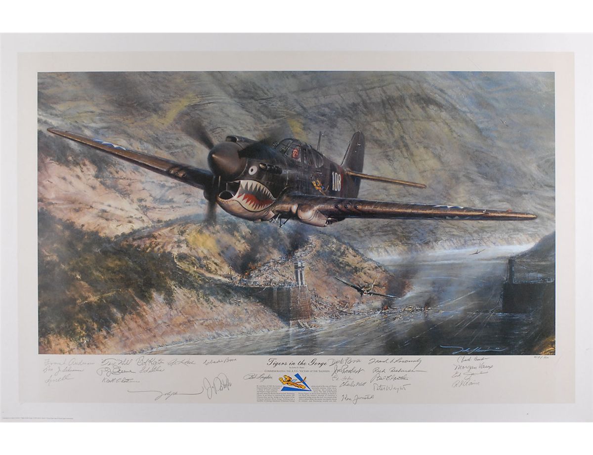 Color limited edition 37 x 24 print entitled ‘Tigers in the Gorge,’ numbered 417/850, signed in pencil by 25 members of the Flying Tigers, including Tex Hill, Frank Anderson, Charles Baisden, Charles Bond, Keith Christensen, Paul Clouthier, Edwin Fobes, Paul Greene, Ed Janski, Kenneth Jernstedt, Al Kaelin, Bob Keeton, Peter Wright, Morgan Vaux, and Edward Siles. Also signed in pencil by the artist, John Shaw. Rolled and in fine condition.