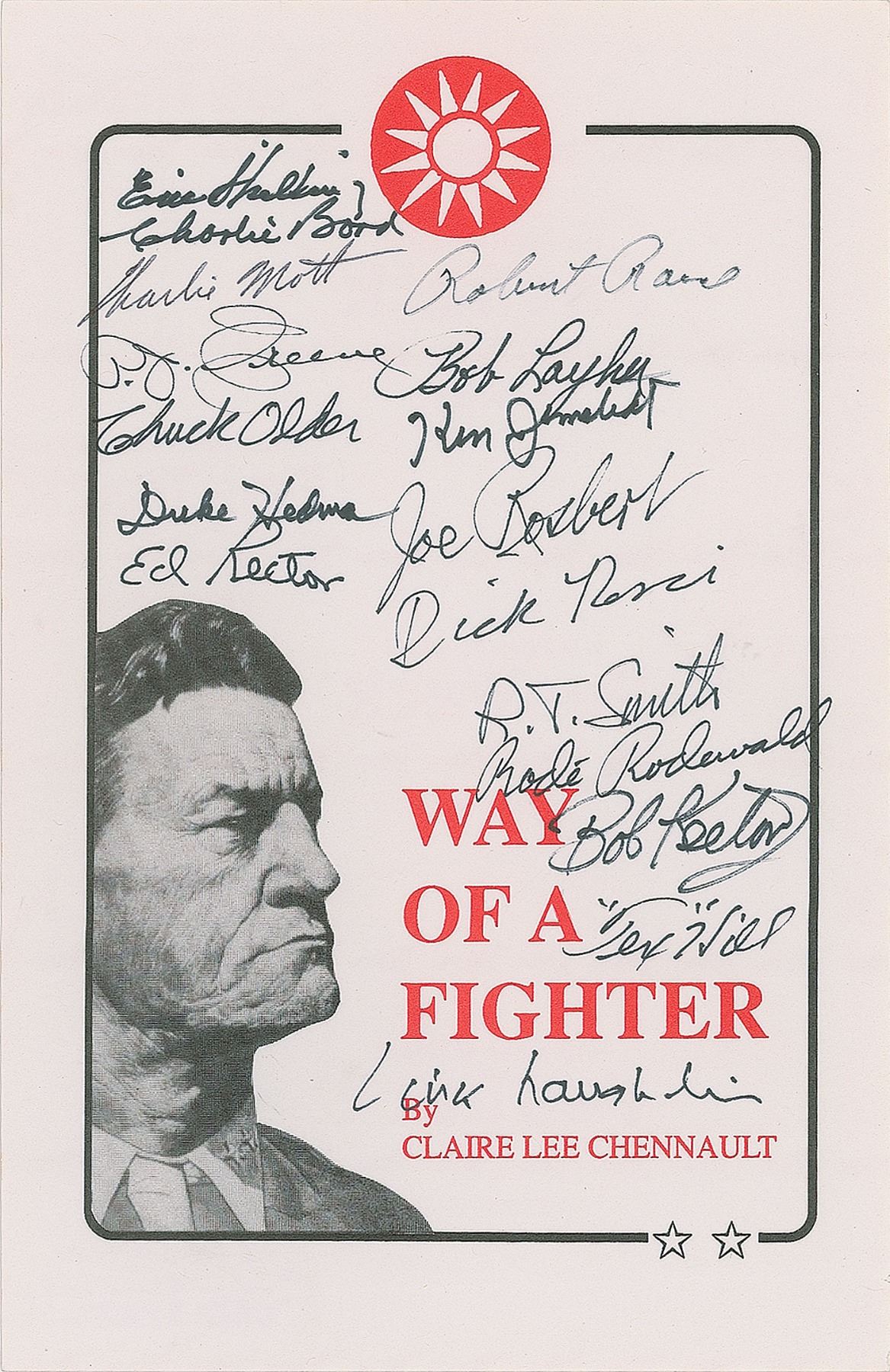 Unused adhesive bookplate for Way of a Fighter by Claire Lee Chennault, 5.5 x 8.5, signed in black felt tip by 17 'Flying Tigers' pilots, including: Erik Shilling, Charlie Bond, Charlie Mott, P. J. Greene, Chuck Older, Duke Hedman, Ed Rector, Robert Raine, Bob Layher, Ken Jernstedt, Joe Rosbert, Richard Rossi, Robert T. Smith, Don Rodewald, Bob Keeton, Tex Hill, and Link Laughlin. In fine condition. Consignor notes that the autographs were obtained at an AVG reunion in the mid-1990s.