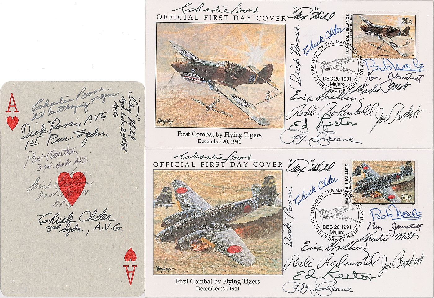 Three items signed by multiple members of the Flying Tigers, including: two uncommon FDCs, both 7.5 x 3.75, and bearing a color cachet honoring the first combat by Flying Tigers on December 20, 1941, with both signed in ink or ballpoint by Charlie Bond, Tex Hill, Chuck Older, Dick Rossi, Bob Neale, Ken Jernstedt, Erik Shilling, Donald Rodewald, Ed Rector, P. J. Greene, and Charles Mott; and an oversized ace of hearts playing card, 3.75 x 5.5, signed in black ink or felt tip by Charlie Bond, Dick Rossi, Tex Hill, Paul Clouthier, Erik Shilling, and Chuck Older. In overall fine condition.