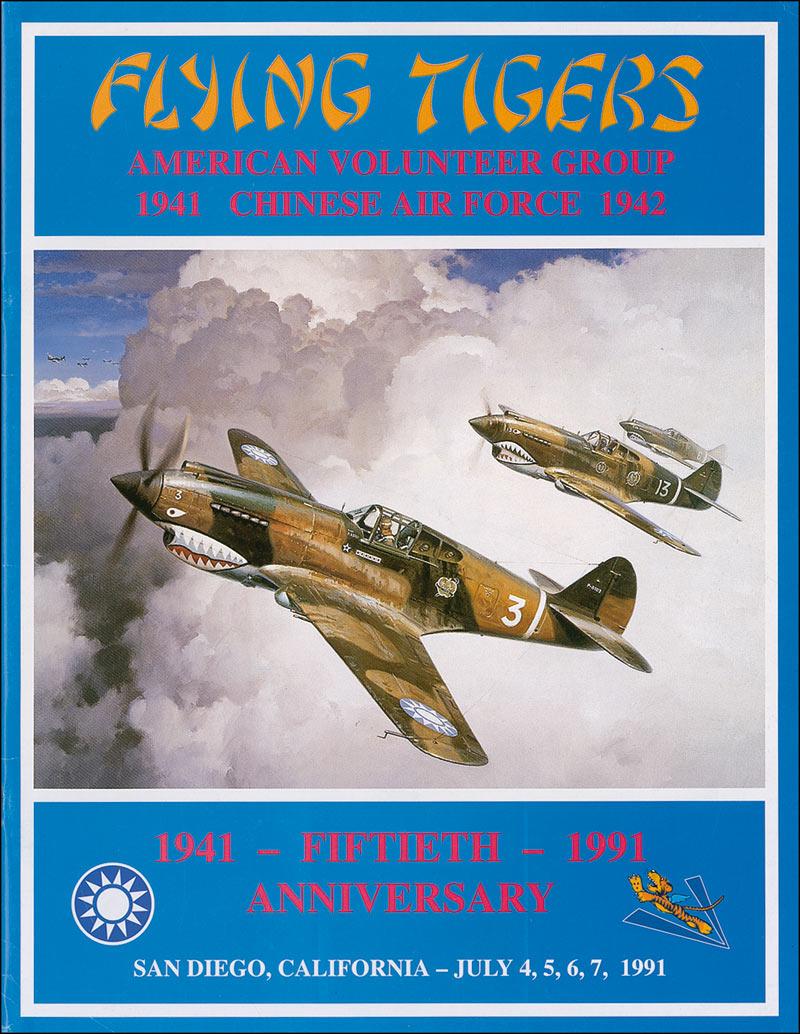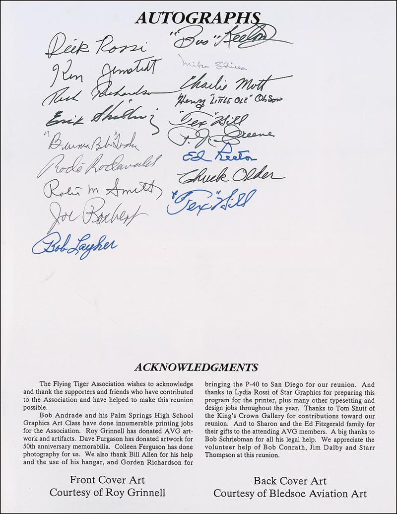 Program from the 50th anniversary of the Flying Tigers, held in San Diego on July 4-7, 1991, signed in ink inside the back cover by Dick Rossi, Rich Richardson, ‘Burma Bob’ Locke, Robert M. Smith, Bob Layher, Mike Shields, Henry ‘Little Ole’ Olson, P. J. Greene, Chuck Older, Ken Jernstedt, Erik Shilling, Rode Rodewald, Joe Rosbert, ‘Bus’ Keeton, Charlie Mott, Tex Hill (signed twice), and Rector. Also signed in ink on their respective photo by Rosbert, Hill, Greene, and Olson. In fine condition.