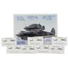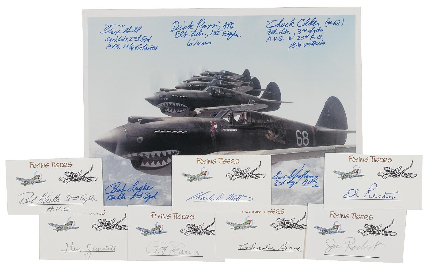 Breathtaking color satin-finish 10 x 8 photo of the squadron in formation near the China-Burma border, signed in blue felt tip by Tex Hill, Dick Rossi, Chuck Older, Bob Layher, and Eric Shilling; and ink and pencil signatures of pilots Ed Rector, Bob Keeton, Charlie Mott, Joe Rosbert, Charlie Bond, P. J. Greene, and Ken Jernstedt on individual 3.5 x 2 Flying Tigers collector’s cards. In fine condition.