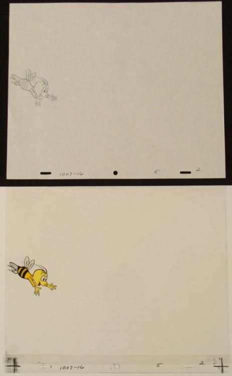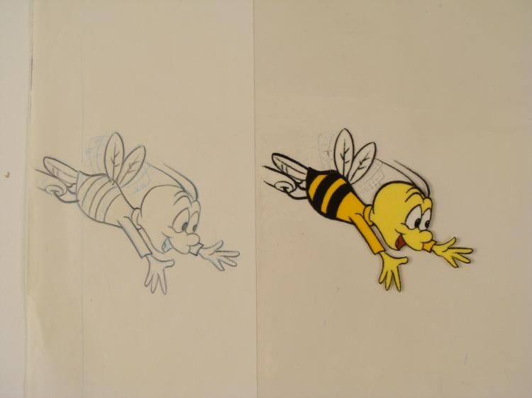 Buzz must be flying towards his delicious cheerios. This original animation cel & drawing are from the production of the Cheerios cereal commercial. Original Animation Cel & DrawingMedium: Hand painted acetate celDetails: Animation notations and peg holes Original "rough" animation drawing, in non-photo blue and black pencil Size of cel: 10 1/2 x 12 1/2 inchesSize of drawing: 10 1/2 x 12 1/2 inches Condition: Very good This is an original hand-painted cel set-up used in the production of the "Cheerios commercial." Each one-of-a-kind set-up represents a slight change in position of the characters. When individually photographed and projected in rapid succession, the images appear to move. To created production cels, the original animator's drawing is transferred onto an acetate cel (by hand-inking and/or photo copying). The cel is then hand-painted on the reverse side. Traditional animation is a multi-step process which includes various types of art techniques. Drawings are a key part of the process, in which the animator creates the design and movement of the characters. Drawings are then transferred onto acetate cels (by hand-inking and/or photo copying) to create a production cel, which is then hand painted on the back side, using paint colors chosen and approved by the creator of the series.