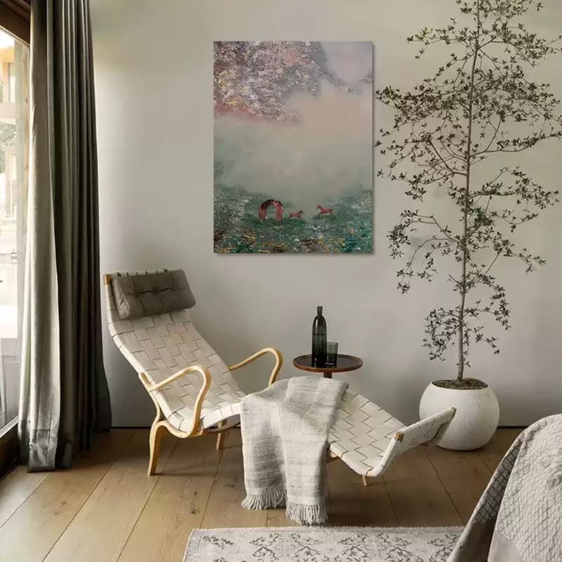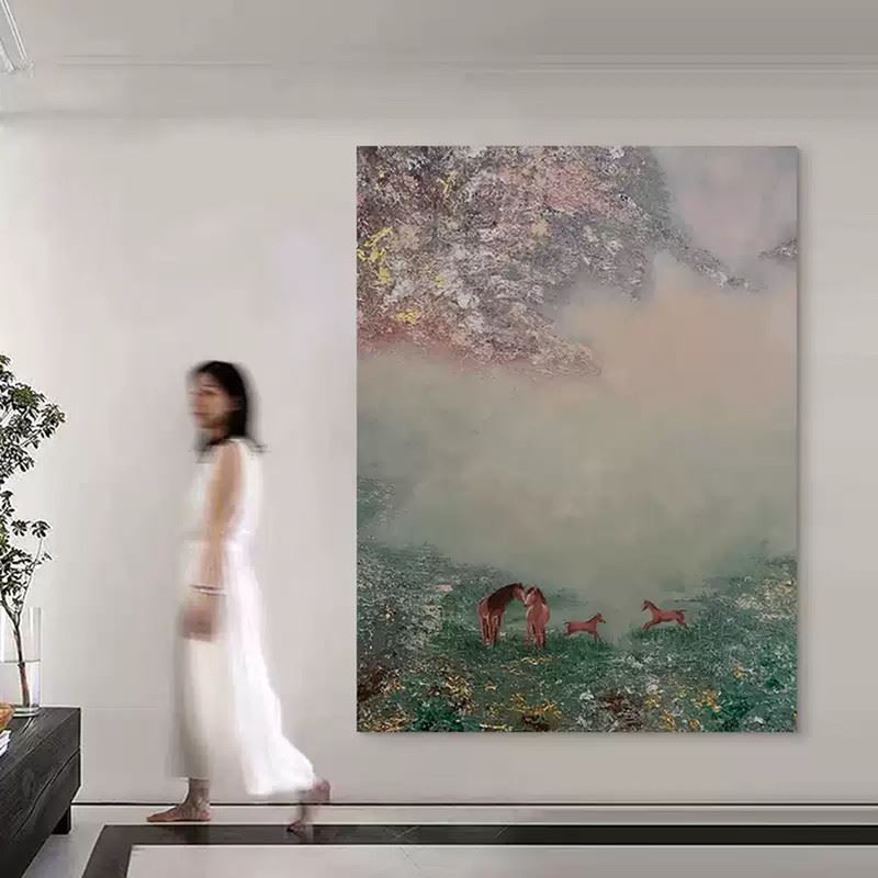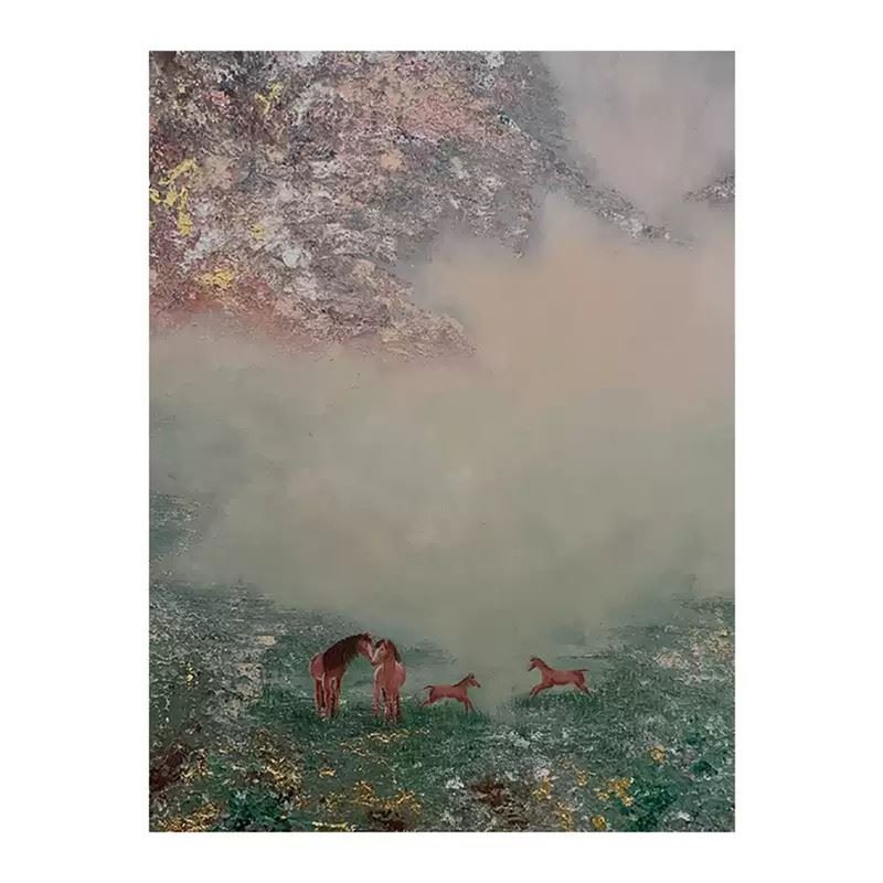 In the painting, several horses and their foals roam freely on the grassland, surrounded by a soft mist that adds a sense of mystery to the scene. The horses' leisurely figures are in harmony with the distant mountains, while specks of gold powder enhance the natural tranquility and vitality. The entire scene exudes peace and life, symbolizing the beauty of nature's balance. Dimensions: 24 x 31 inches.