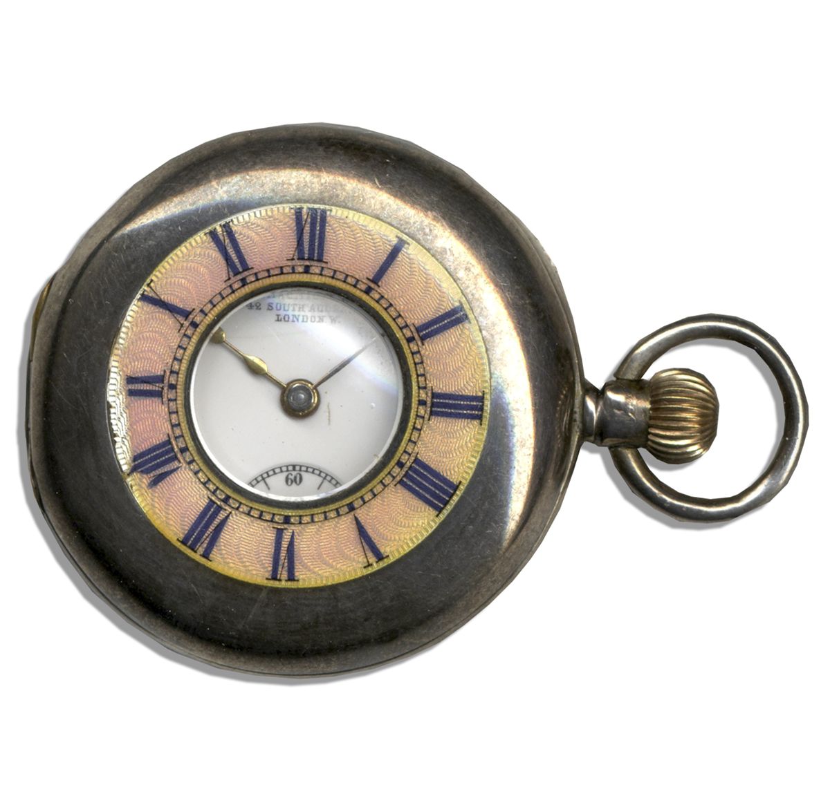 Duke and Duchess of Windsor owned fob watch. Timepiece by J. MacMichael features a pure white dial with black Roman numerals, gold hour hand and silver minute hand. Housed in a silver shell casing with a glass window on the front showing the position of the hands. Window is surrounded by an engine turned guilloche enamel band in pink with Roman numerals in dark blue. Cover opens on a hinge. Measures 1.5'' in diameter. Tarnishing, some enamel loss near 8 and 9 o'clock, loss of interior crystal and lid tends to pop open. In good to very good condition overall. Provenance from the Sotheby's auction of The Jewels of the Duchess of Windsor, held 3 April 1987 in Geneva, lot 249.