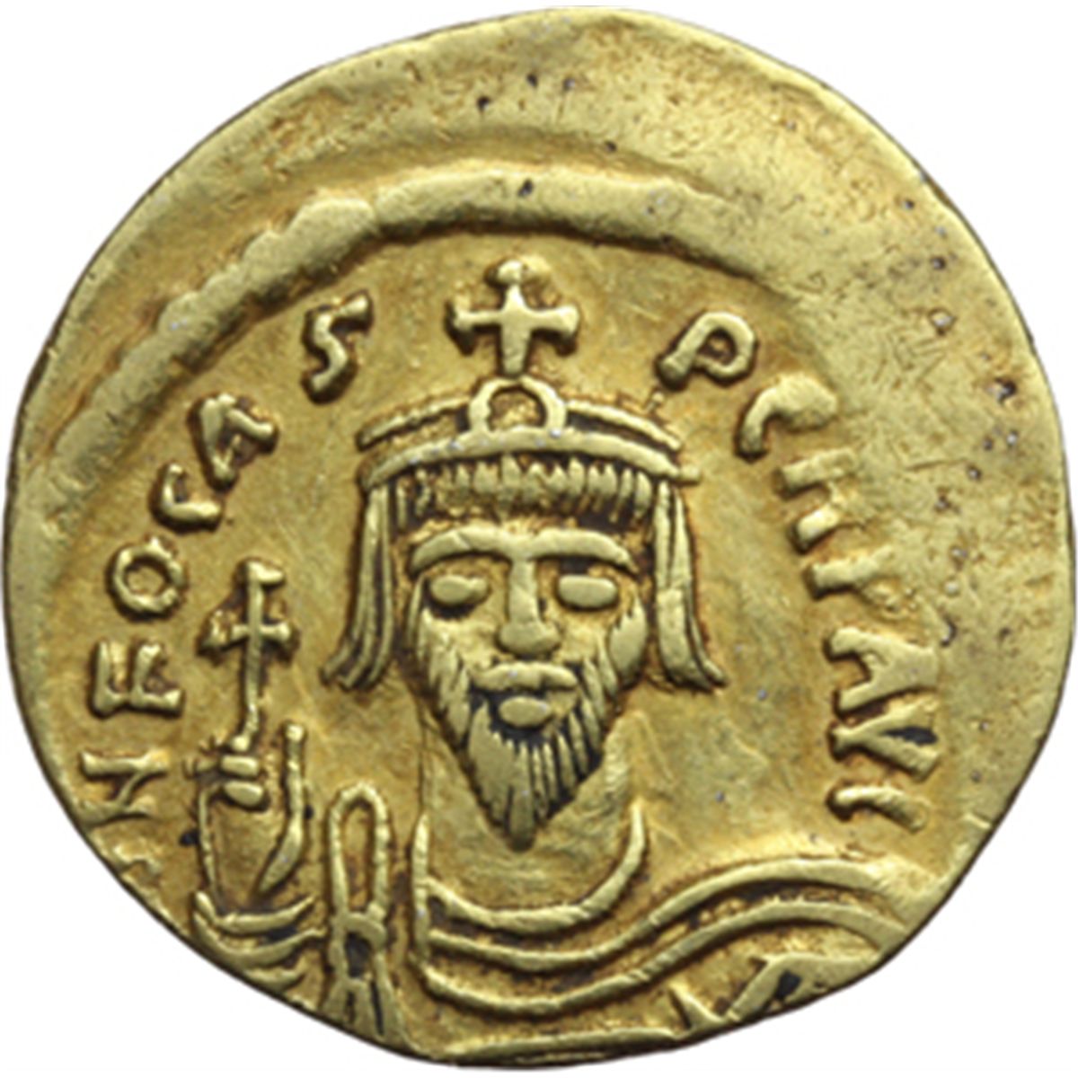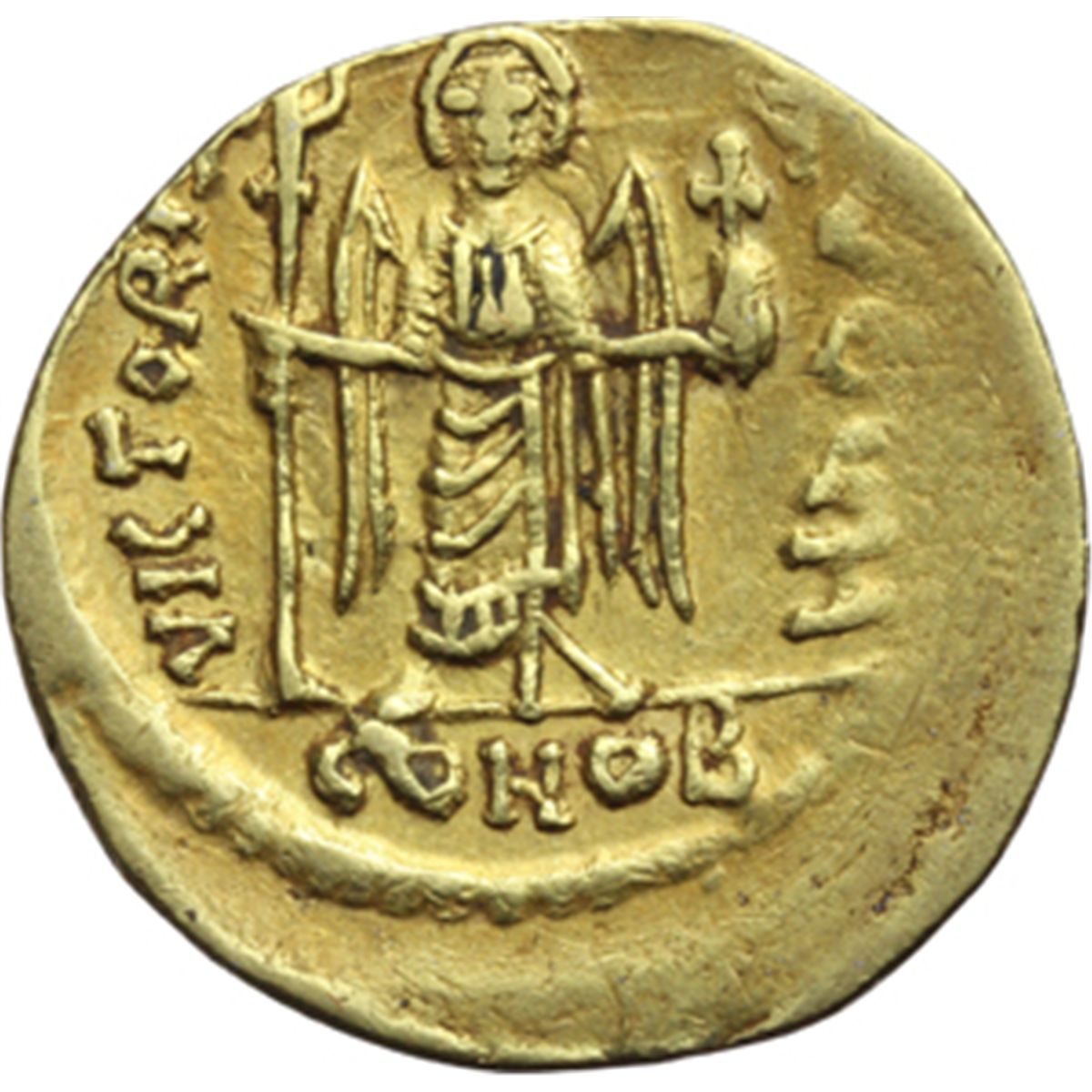 Impero Bizantino. Focas (602-610). Solido, Costantinopoli. D/ dN FOCAS PERP AVGy H. Angelo stante di fronte tiene asta sormontata da Cristogramma invertito e globo crucigero. In esergo: CONOB. R/ D.O.10. Sear 620. AU. g. 4.43 mm. 21.00 BB.
