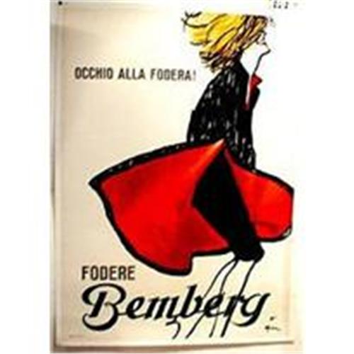 About 55 x 39 inches. A bold and sweeping curve dominates this design as an Italian woman shows off her beautiful outfit. This authentic poster from the 1960's was excuted by the infamous artist Gruau, who was known for his genius in fashion graphics. One look at his dramatic and vibrant images would be an advertising success for the company. In this particular case...The poster glamorizes the Bemberg fabrics. The poster is in A condition and has been professionally preserved and mounted on linen. Certificate of Authenticity is provided.