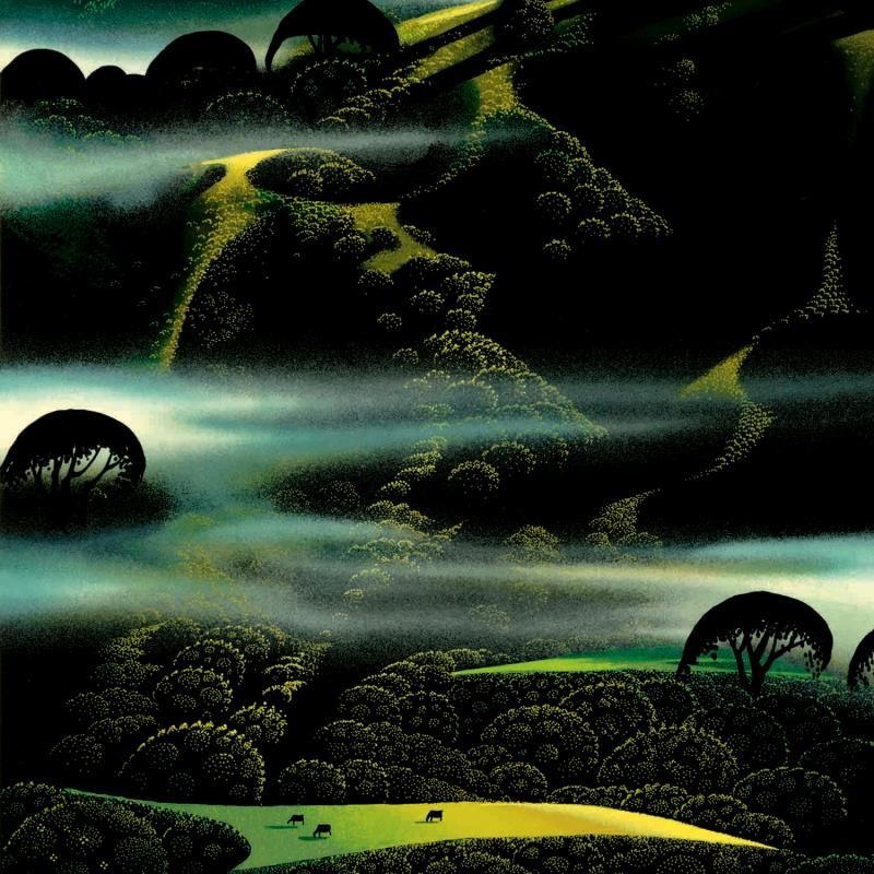 "Fog Draped Hills" is a limited edition serigraph on paper by Eyvind Earle (1916-2000). The piece is numbered, hand-signed by the artist, and accompanied by a certificate of authenticity. Measures approximately 20" x 16" (image).