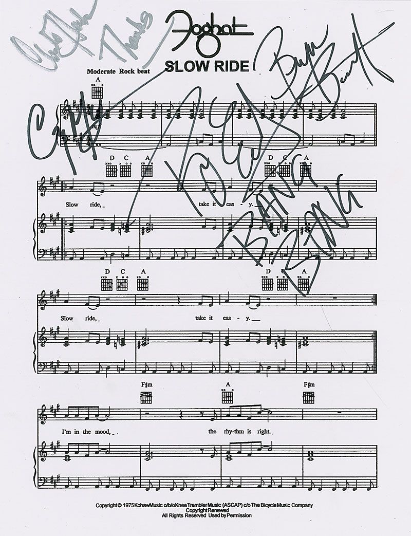 Printed sheet music to the beginning of ‘Slow Ride,’ one cardstock page, 8.5 x 11, signed in black felt tip and silver ink by Roger Earl, Craig MacGregor, Charlie Huhn, and Bryan Bassett. In very fine condition.