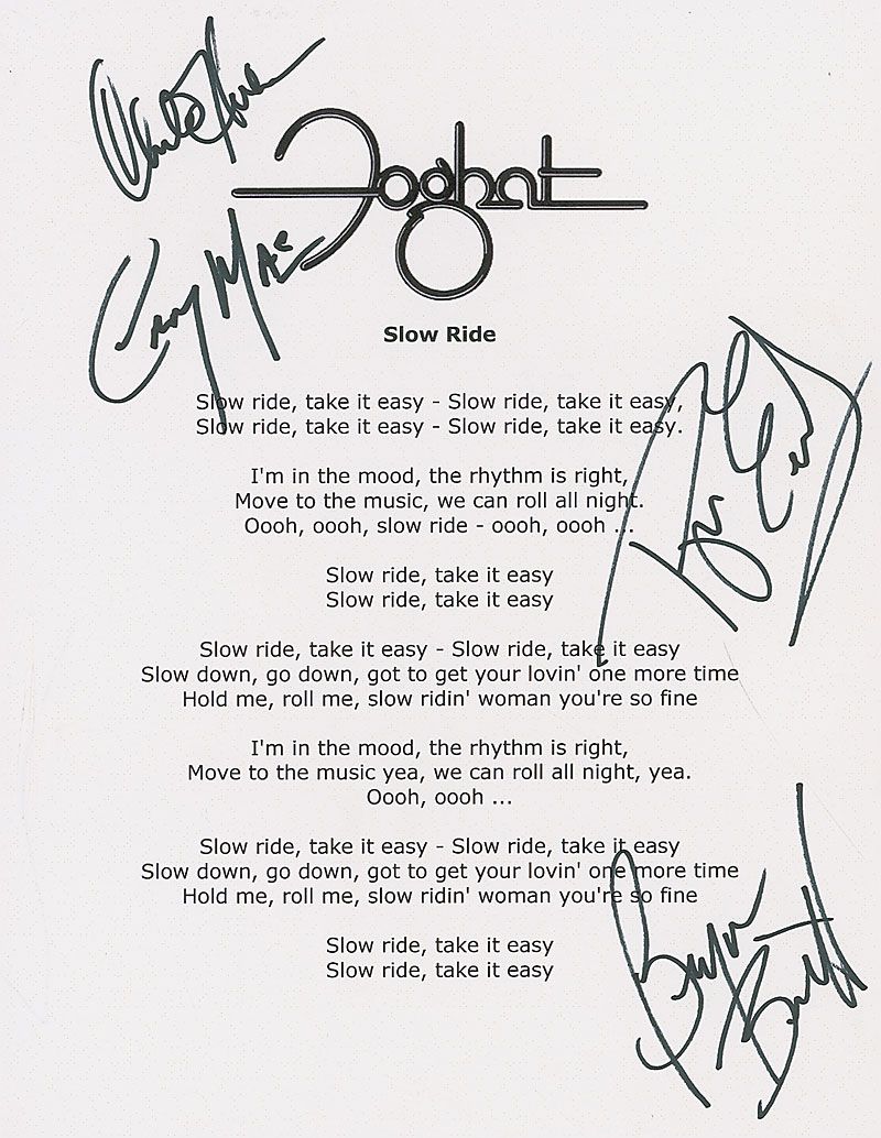 Souvenir printed lyrics to ‘Slow Ride,’ 8.5 x 11, with the band’s name at the top, signed in black felt tip by Roger Earl, Craig MacGregor, Charlie Huhn, and Bryan Bassett. In very fine condition.