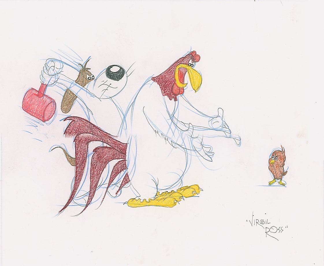 (Warner Brothers Studios, circa 1990s) Original drawing by Virgil Ross featuring Foghorn Leghorn, Henery Hawk, and Barnyard Dawg, which shows the two birds in conversation, while the basset hound winds up to smack Foghorn with a large mallet. Accomplished in graphite and colored pencil on untrimmed 12.5 x 10.5 animation paper, signed at the bottom in pencil, "Virgil Ross." In fine condition. This one-of-a-kind drawing was done to be sold in the Warner Brothers Studio stores in the 1990s.